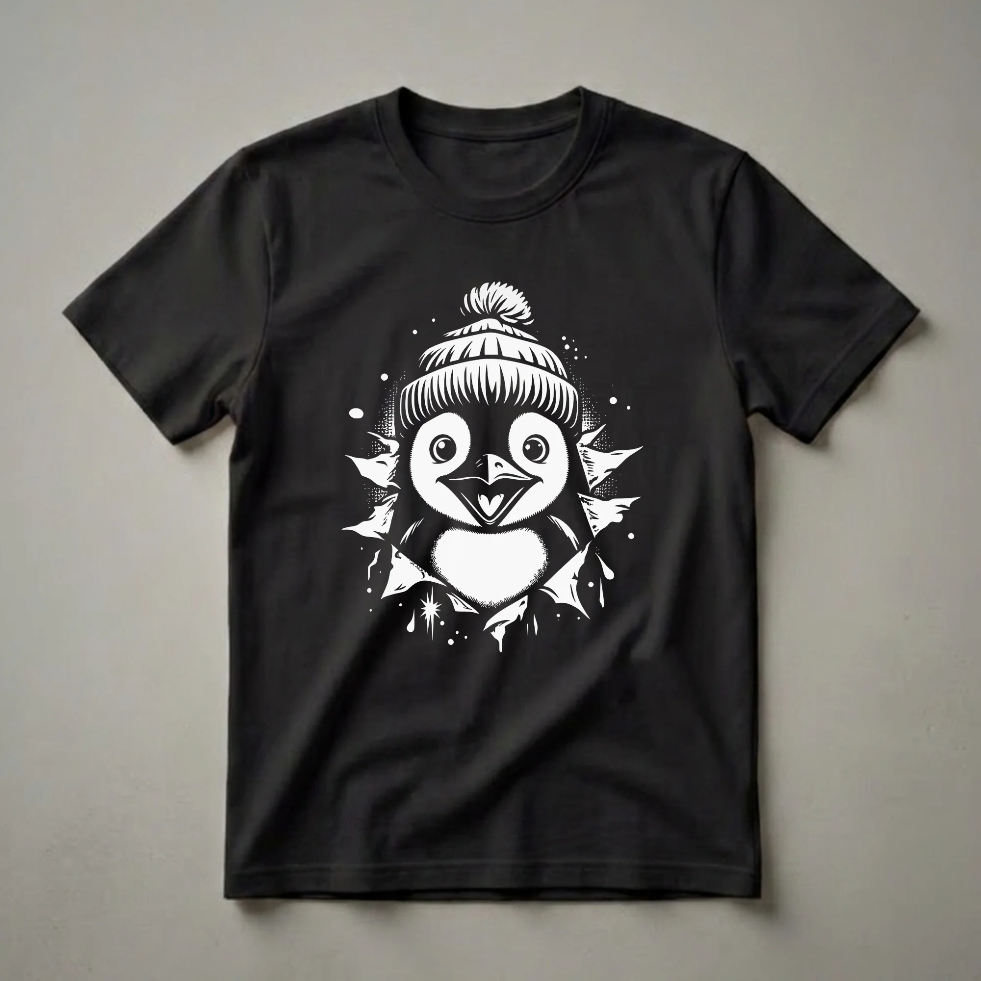 Penguins are flightless birds known for their distinctive black and white plumage and their ability to thrive in cold climates, particularly in the Southern Hemisphere. This graphic tee captures the playful spirit of these fascinating creatures with a humorous design. The artwork showcases a cartoon penguin, complete with a cozy beanie, bursting through a torn background. Scattered dots and starbursts add a whimsical touch, making this shirt a standout piece for anyone who appreciates unique animal art. This t-shirt is a thoughtful gift for friends or family members who adore penguins or have a fondness for quirky, eye-catching apparel. It’s the perfect shirt to wear to casual gatherings, game nights, or just for a fun day out, bringing a smile to everyone who sees it. The design’s bold contrast and expressive character make it a conversation starter, well suited for those who love to express their personality through their clothing. Whether you're a dedicated penguin enthusiast or simply looking for a fun addition to your wardrobe, this tee offers a delightful way to showcase your sense of humor and love for wildlife.