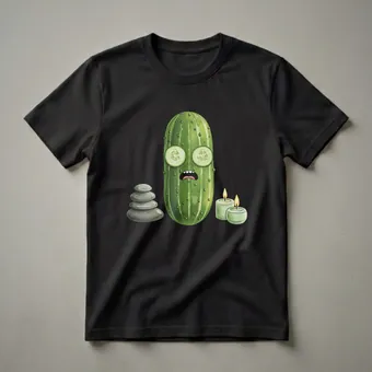 Pickle lovers who appreciate a good pun will reach for this eye-catching graphic tee. The design showcases a whimsical watercolor illustration of a pickle undergoing a spa treatment. Complete with cucumber slices over its eyes, a stack of smooth, grey spa stones, and two softly glowing green candles, this shirt captures a moment of pure relaxation. Cucumbers, known for their high water content and cooling properties, are a staple in spa treatments, making this a clever visual pun. This t-shirt is a thoughtful gift for anyone who enjoys a good laugh and a bit of self-care, perhaps for a friend who needs a reminder to unwind or for yourself after a long week. It’s a fun way to express your love for quirky humor and vegetables. Wear this tee to your next casual gathering, game night, or just while lounging at home, bringing a smile to everyone's face with its unique and playful design. This shirt is a staple in any collection of funny food-themed apparel.