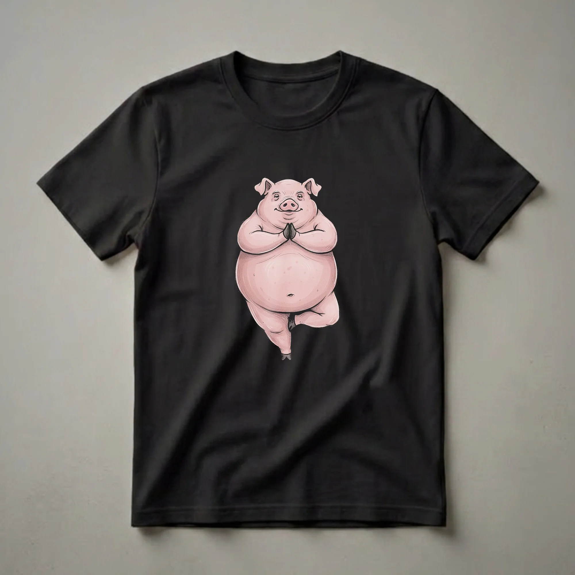 - This t-shirt features a humorous illustration of a pig performing the yoga tree pose.