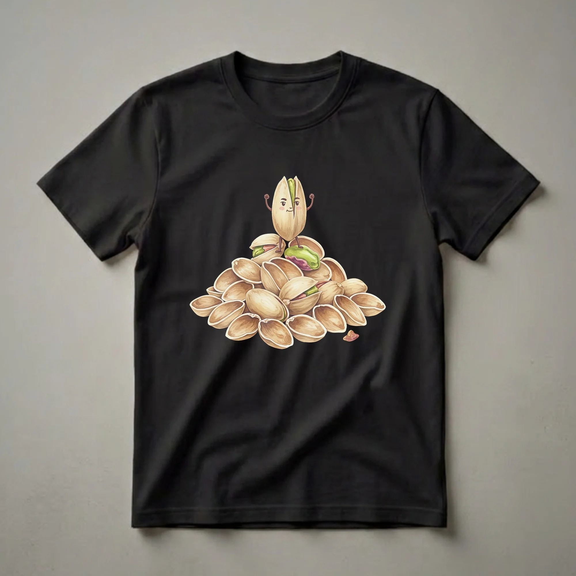 Pistachio lovers who appreciate a good snack will reach for this eye-catching graphic tee. The design features a whimsical watercolor illustration of a pile of pistachios, with one anthropomorphic pistachio character standing proudly on top. This little guy has a cheerful face, rosy cheeks, and is striking a pose with flexed arms, embodying the spirit of a champion nut. Scattered around are more pistachios, some open to reveal their vibrant green kernels, and a few stray shells. Pistachios, native to Central Asia and the Middle East, are known for their distinctive flavor and satisfying crunch. They are a popular snack enjoyed worldwide, often found in baked goods, ice cream, and savory dishes. This shirt is a fun way to celebrate your passion for these delicious nuts. It makes a thoughtful gift for anyone who enjoys snacking on pistachios, whether they are a foodie, a chef, or simply someone who loves a good pun. Wear this tee to your next casual gathering, while enjoying your favorite snacks, or just to bring a smile to people's faces.