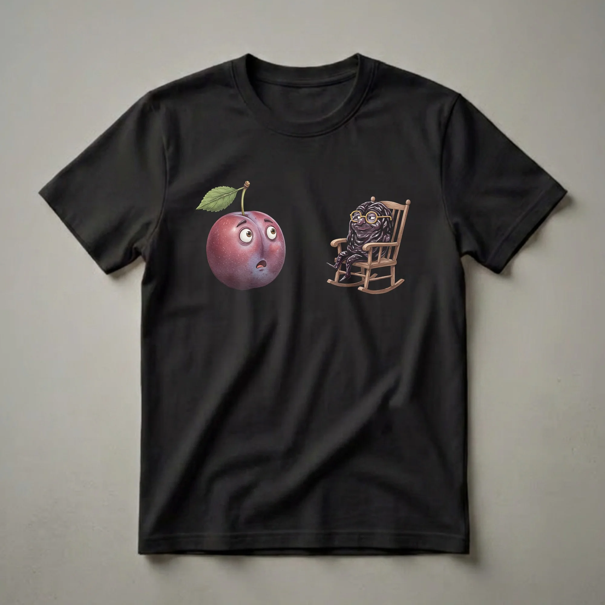 Fruit lovers and foodies will appreciate this eye-catching graphic tee featuring a whimsical scene. On the left, a plump, red plum with wide, surprised eyes and a single green leaf attached to its stem looks on with a comical expression. To its right, a wrinkled raisin character, sporting round yellow glasses and a knowing smirk, relaxes in a wooden rocking chair. This playful design captures the essence of fruit humor, transforming everyday produce into characters with personality. Plums, known for their sweet and tart flesh, are a versatile fruit enjoyed fresh, dried, or in jams and preserves. Raisins, which are simply dried grapes, offer a concentrated sweetness and chewy texture, often used in baking and snacking. This shirt makes a thoughtful gift for anyone who enjoys a good food pun or appreciates unique, artistic designs. It's a great conversation starter and a fun way to express a love for all things fruity. Wear this t-shirt to casual gatherings, picnics, or simply when you want to add a touch of humor to your day.