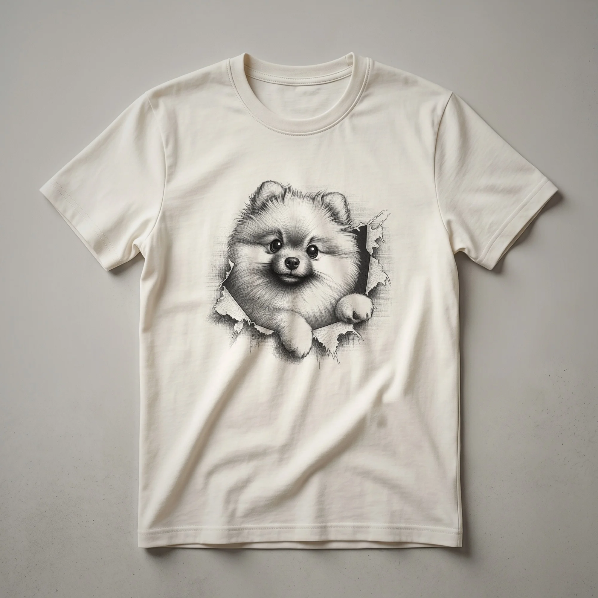 - A humorous Pomeranian peeking dog graphic tee for Pom lovers.