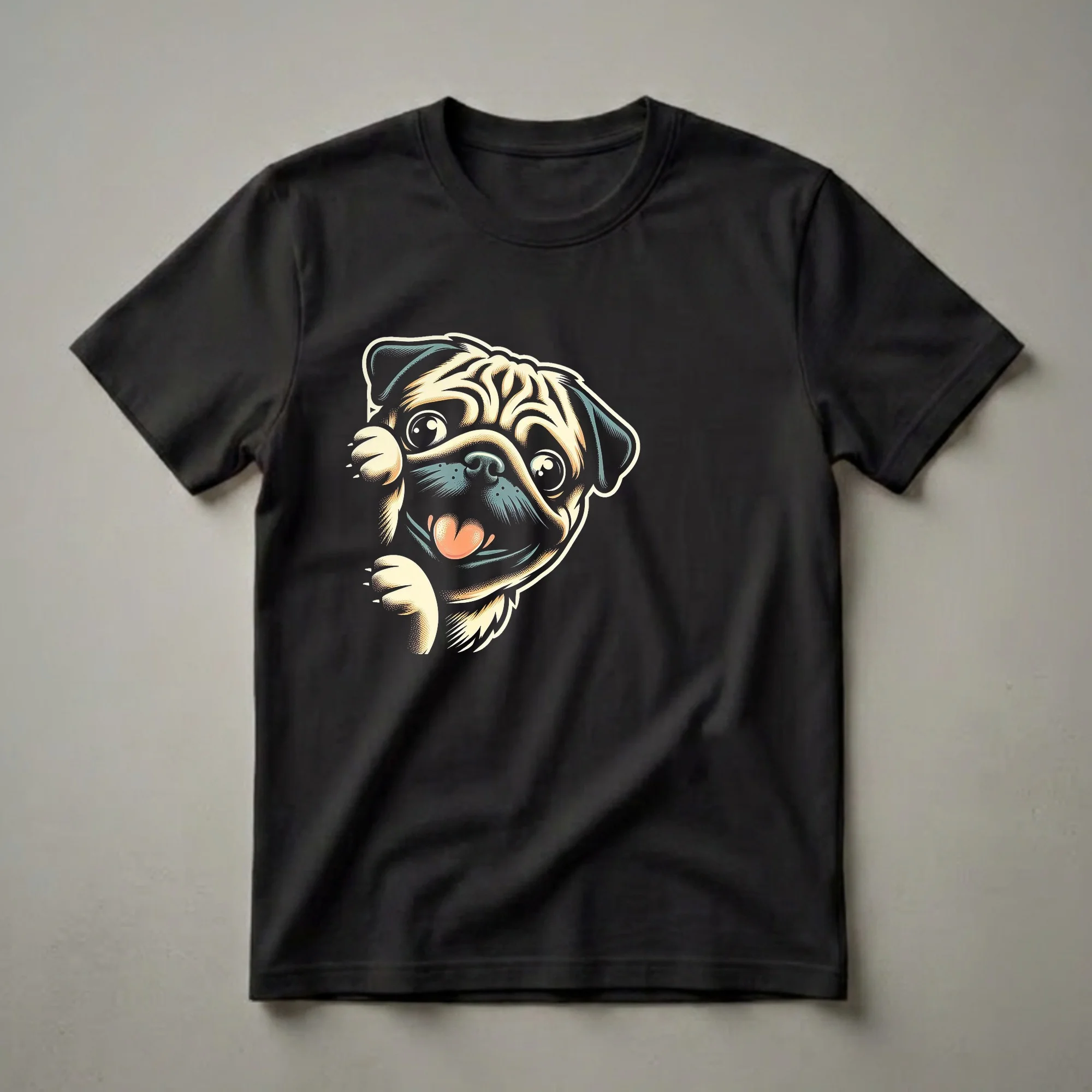 Pug owners know the breed's distinctive wrinkled face and playful personality. This graphic tee captures that charm with a stylized illustration of a pug peeking out, its tongue playfully lolling. The art style features bold outlines and a retro comic aesthetic, making the pug's expression undeniably endearing. Pugs, originating from China, are known for their affectionate nature and often comical antics, making them a beloved companion. This t-shirt is a fantastic way for any pug mom or pug dad to express their adoration for their four-legged friend. It makes a thoughtful gift for birthdays, holidays, or just because for the dog lover in your life. Wear this shirt to casual outings, dog park visits, or simply while relaxing at home with your furry companion.