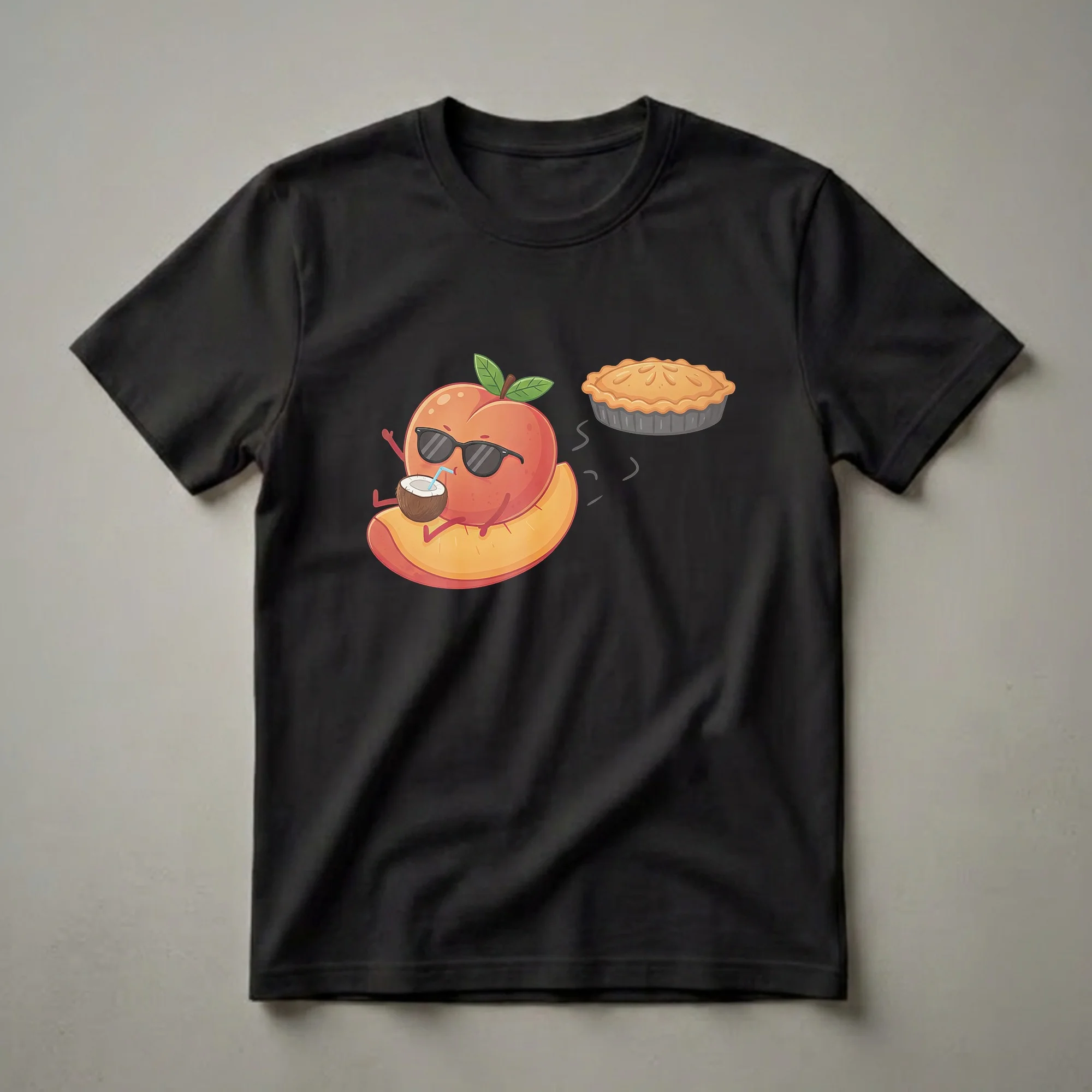 Peach lovers who appreciate a good slice of pie will reach for this humorous graphic tee. The design features a cheerful, anthropomorphic peach wearing cool sunglasses and sipping from a coconut drink, all while lounging on a juicy peach slice. Beside it, a golden-brown peach pie bakes, its lattice top hinting at deliciousness. This playful imagery captures the essence of relaxation and indulgence, making it a delightful addition to any foodie's wardrobe. Peaches, known for their fuzzy skin and sweet, succulent flesh, are a beloved summer fruit, often celebrated in pies and cobblers. This shirt is a fun way for bakers, dessert enthusiasts, or anyone who simply enjoys a sweet treat to express their passion. It makes a thoughtful gift for friends, family, or colleagues who have a sweet tooth or a great sense of humor. Wear this t-shirt to casual gatherings, picnics, or while enjoying your favorite baked goods.
