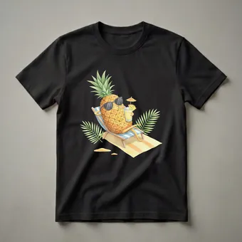 Pineapple lovers who embrace the summer spirit will reach for this eye-catching graphic tee. The design showcases a whimsical pineapple character, complete with sunglasses and a straw in its drink, lounging on a beach chair. Palm fronds frame the scene, and a small slice of pineapple with a smiling face adds a touch of playful charm. This t-shirt captures the essence of a carefree summer vacation, evoking images of sandy beaches and tropical getaways. Pineapples, native to South America, are known for their sweet and tangy flavor, making them a popular fruit worldwide. This shirt works well for anyone who enjoys a good laugh and a relaxed vibe, whether they're heading to the beach, a summer party, or just want to bring a bit of sunshine into their day. It makes a thoughtful gift for friends or family who appreciate quirky fruit humor and the joy of summer. Wear this tee to your next beach outing or casual gathering to showcase your fun-loving personality.