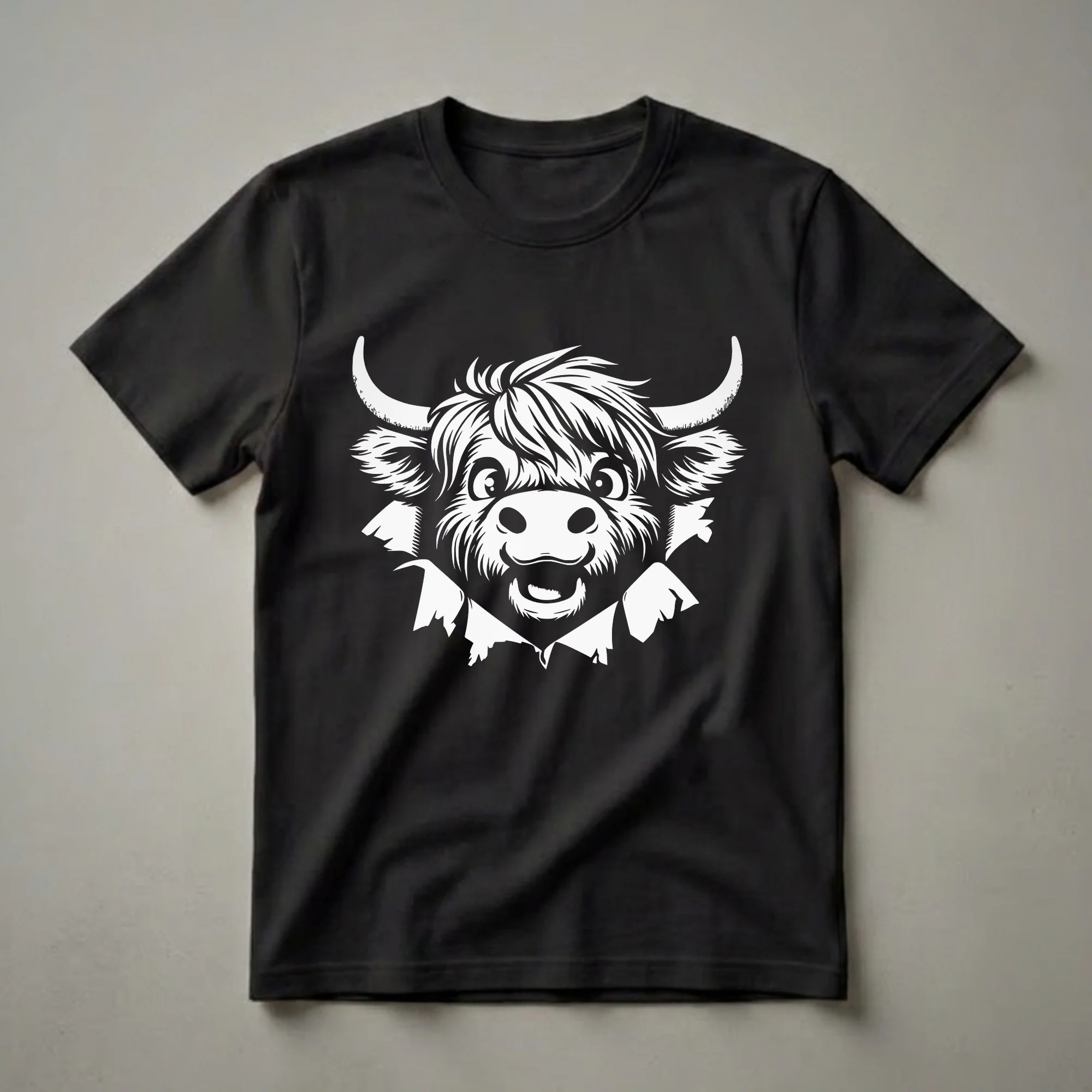 Animal lovers with a fondness for fuzzy Scottish Highland cows will adore this humorous graphic t-shirt featuring a cow peeking through torn paper.This graphic tee captures the playful spirit of these gentle giants with a humorous design featuring a cartoon Highland cow peeking through torn paper. The black and white artwork presents a striking visual that is sure to turn heads. This t-shirt is a fantastic way for any cow enthusiast or lover of quirky animal designs to express their personality. It's a thoughtful gift for friends or family members who appreciate a good laugh and have a soft spot for these charming bovines. Imagine wearing this eye-catching shirt to a casual get-together, a farm visit, or simply while relaxing at home. It’s a conversation starter that brings a smile to everyone who sees it. This unique shirt is a staple for anyone looking to add a touch of fun and whimsy to their wardrobe, celebrating the unique charm of the Highland cow.