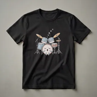 Drummers who appreciate a good night's sleep will love this eye-catching graphic tee. The design showcases a full drum kit, complete with cymbals, snare, and bass drum, all rendered in a charming kawaii style. The central bass drum is personified as a character, depicted with closed eyes, rosy cheeks, and a gentle smile, adorned with 'Zzz' symbols indicating it's fast asleep. The other drums and cymbals also feature subtle sleepy faces. This shirt is a thoughtful gift for any percussionist, whether they are a seasoned professional or a budding musician learning the basics of rhythm and beat. A drum set is a complex instrument, requiring coordination across multiple components to create a cohesive sound. This tee celebrates the drummer's dedication, even in their downtime. It's a staple in the collection for anyone who finds joy in the powerful sound of a drum kit. Wear this t-shirt to band practice, music lessons, or casual outings to show off your passion for drumming.