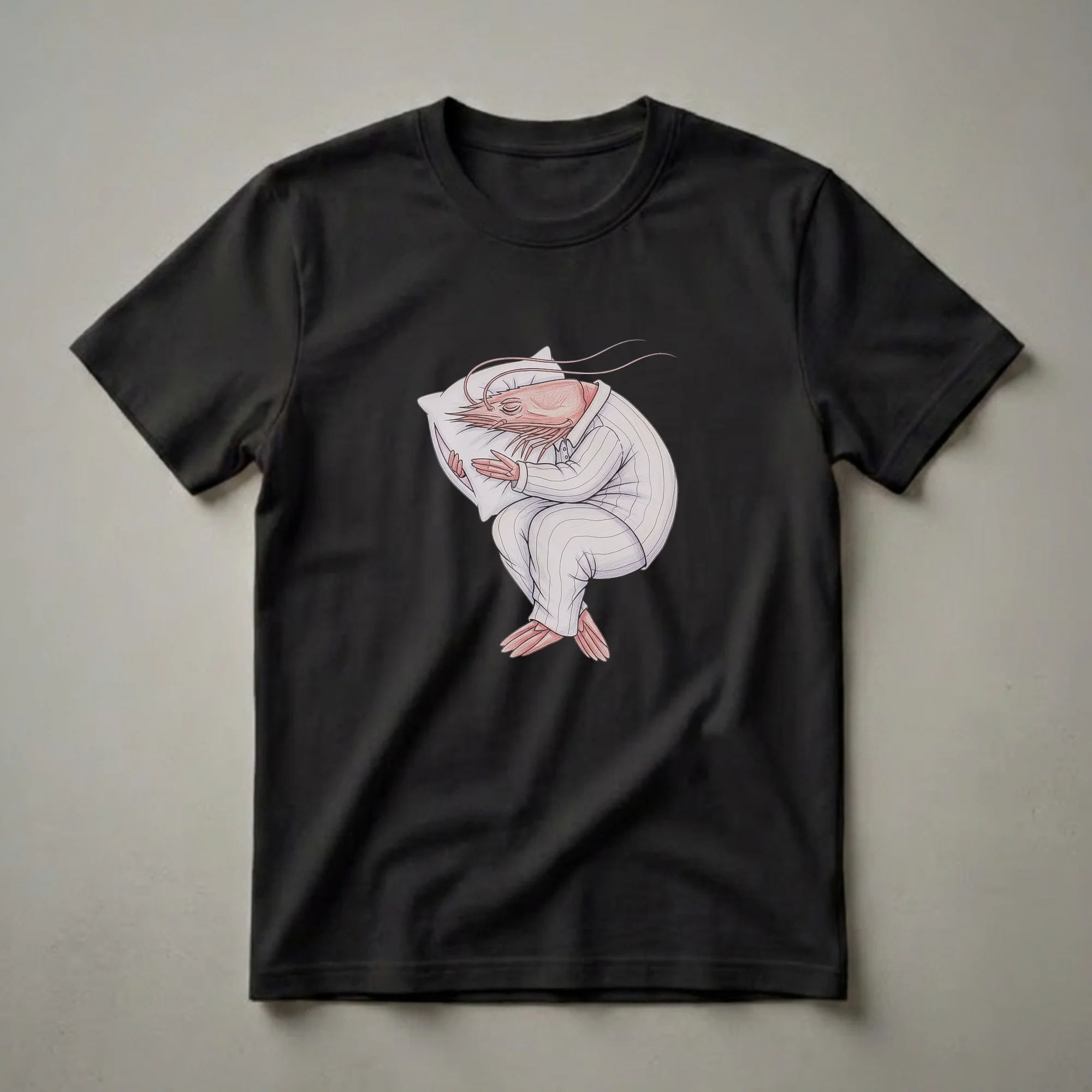 Shrimp lovers and those who appreciate a good nap will reach for this unique graphic tee. The artwork depicts a shrimp, complete with antennae and segmented body, curled up comfortably on a pillow. It's dressed in classic white pajamas with thin pinstripes, buttoned up at the collar, and its eyes are closed in peaceful slumber. The shrimp's delicate legs are tucked in, and its hands cradle the pillow, embodying the ultimate state of relaxation. This whimsical design captures the universal desire for rest and adds a touch of playful humor to your wardrobe. It’s a thoughtful gift for anyone who identifies with the sleepy shrimp, perhaps a student pulling all-nighters or a professional who cherishes their downtime. This t-shirt works well for casual outings, lounging at home, or even as a conversation starter at a game night. Imagine wearing this to a relaxed brunch or while enjoying a quiet evening in. The detailed drawing style brings this sleepy crustacean to life, making it a standout piece for those who enjoy quirky and humorous apparel. It’s a staple in the collection for anyone who loves a good laugh and a cozy night's sleep.