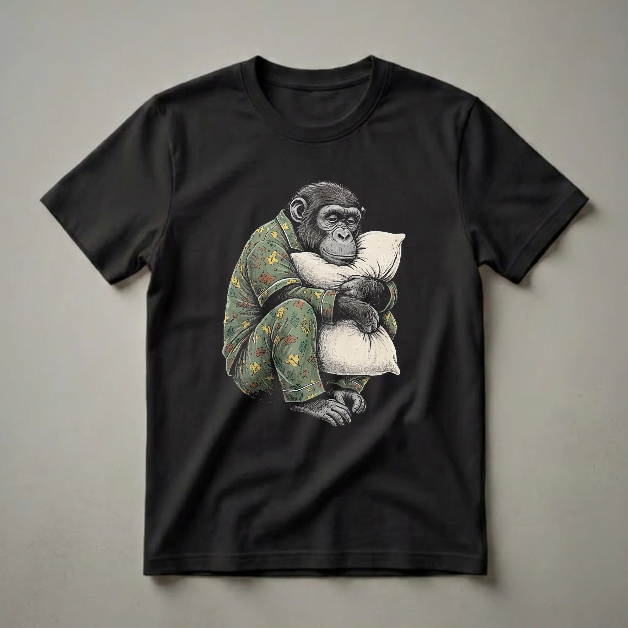 - Features a humorous illustration of a sleepy chimpanzee in pajamas, a perfect tee for animal lovers.