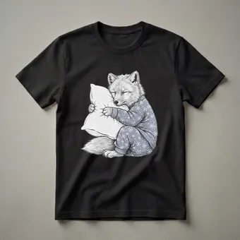 Arctic foxes, known for their thick white fur that helps them blend into snowy environments, are masters of survival in harsh, cold climates. This graphic tee captures a whimsical side of these creatures, depicting a charming arctic fox nestled comfortably in pajamas and embracing a plush pillow. The detailed sketch showcases the fox with its eyes closed, embodying a deep sense of slumber. The pajamas are adorned with a playful snowflake pattern, adding a touch of wintery coziness to the design. This t-shirt is a delightful choice for anyone who appreciates the humor in animal antics or simply loves a good nap. It makes a thoughtful gift for friends or family members who identify with the fox's desire for rest, perhaps after a long day or as a cozy addition to their loungewear collection. Imagine wearing this tee on a lazy weekend morning or during a relaxed game night, bringing smiles with its endearing depiction of a sleepy arctic fox. This shirt is a go-to tee for those who understand the universal appeal of a comfortable nap.