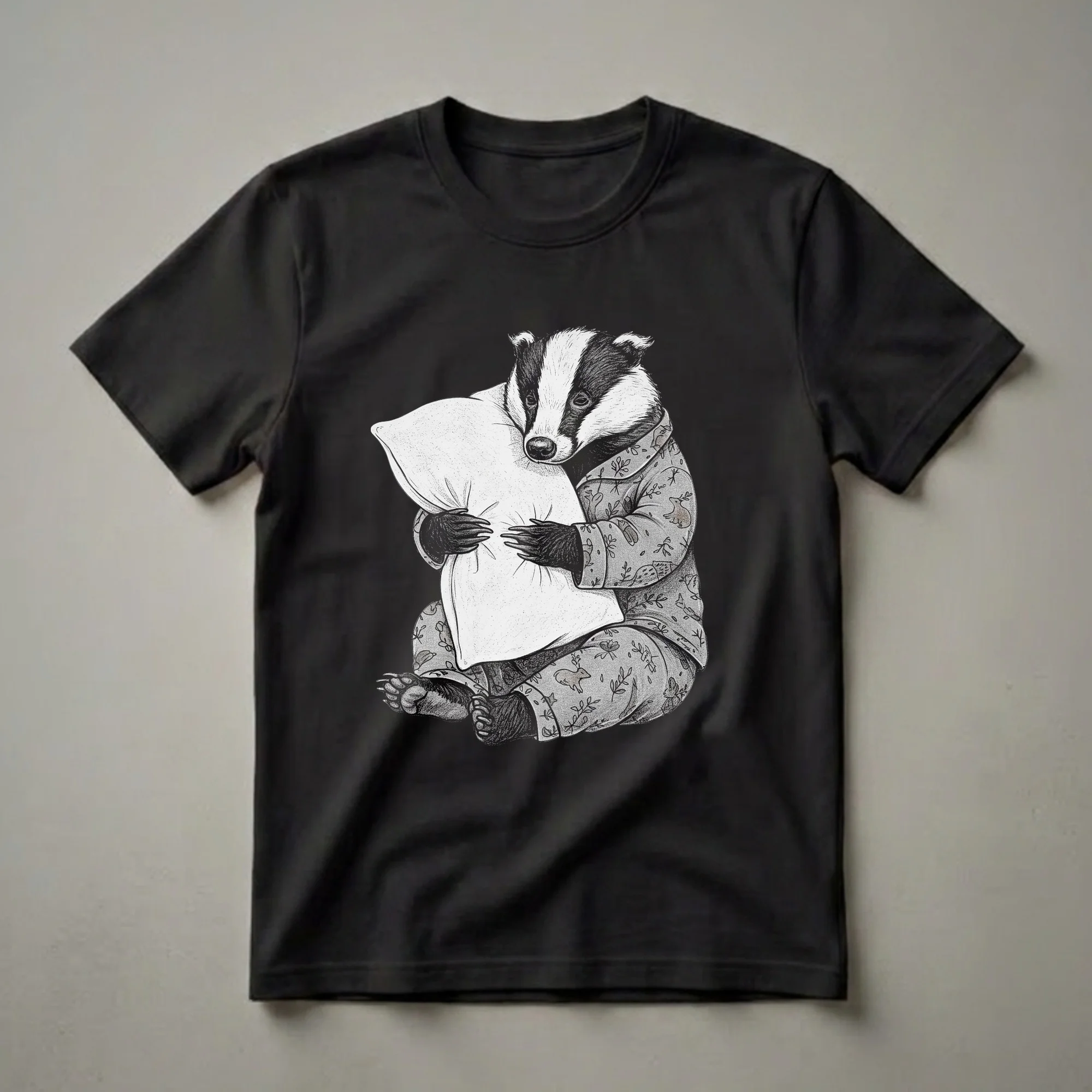 Badgers are known for their powerful build and nocturnal habits, often spending their days in their setts. This graphic tee captures that sleepy, cozy vibe with a charming illustration of a badger dressed in pajamas and clutching a pillow. The detailed artwork showcases the badger's distinctive black and white facial markings and its furry paws. The pajamas themselves are adorned with a whimsical pattern featuring small deer, leaves, and other woodland elements, adding to the overall charm of this unique shirt. This t-shirt is a thoughtful gift for anyone who appreciates a good night's sleep or has a soft spot for these fascinating nocturnal creatures. It's a staple in the collection for those who love to express their personality through their clothing. Whether you're lounging at home, heading to a casual brunch, or enjoying a game night, this tee offers comfort and a touch of humor. It's a go-to tee for women, men, and kids who enjoy a playful and relatable design. Imagine gifting this to a friend who always needs an extra hour of sleep or a family member who adores woodland animals. This shirt is a conversation starter and a comfortable addition to any casual wardrobe, a thoughtful choice for anyone who identifies with the badger's desire for rest.
