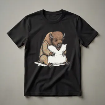 Bison, also known as American buffalo, are iconic North American mammals that once roamed the Great Plains in vast herds. These majestic creatures, known for their shaggy coats and impressive horns, are often associated with strength and resilience. However, this graphic tee presents a different side of the bison, one that is utterly relatable for anyone who appreciates a good, long nap. The artwork features a charmingly drawn bison dressed in cozy plaid pajamas, complete with a checkered pattern in shades of brown and teal. It's depicted sitting down, clutching a large white pillow, with a distinctly sleepy expression on its face. This t-shirt is a humorous nod to those moments when all you want to do is curl up and rest. It's a staple in the collection for anyone who identifies with the desire for comfort and relaxation after a long day. This tee works well for those who love animals and appreciate a bit of whimsy in their wardrobe. It makes a thoughtful gift for friends or family members who are always ready for a cozy evening or a lazy weekend morning. Imagine gifting this to your favorite sleepyhead; they'll reach for this tee often. It's a fun way to express a love for wildlife with a playful, pajama-clad twist, well suited for casual wear, lounging at home, or even as actual sleepwear.