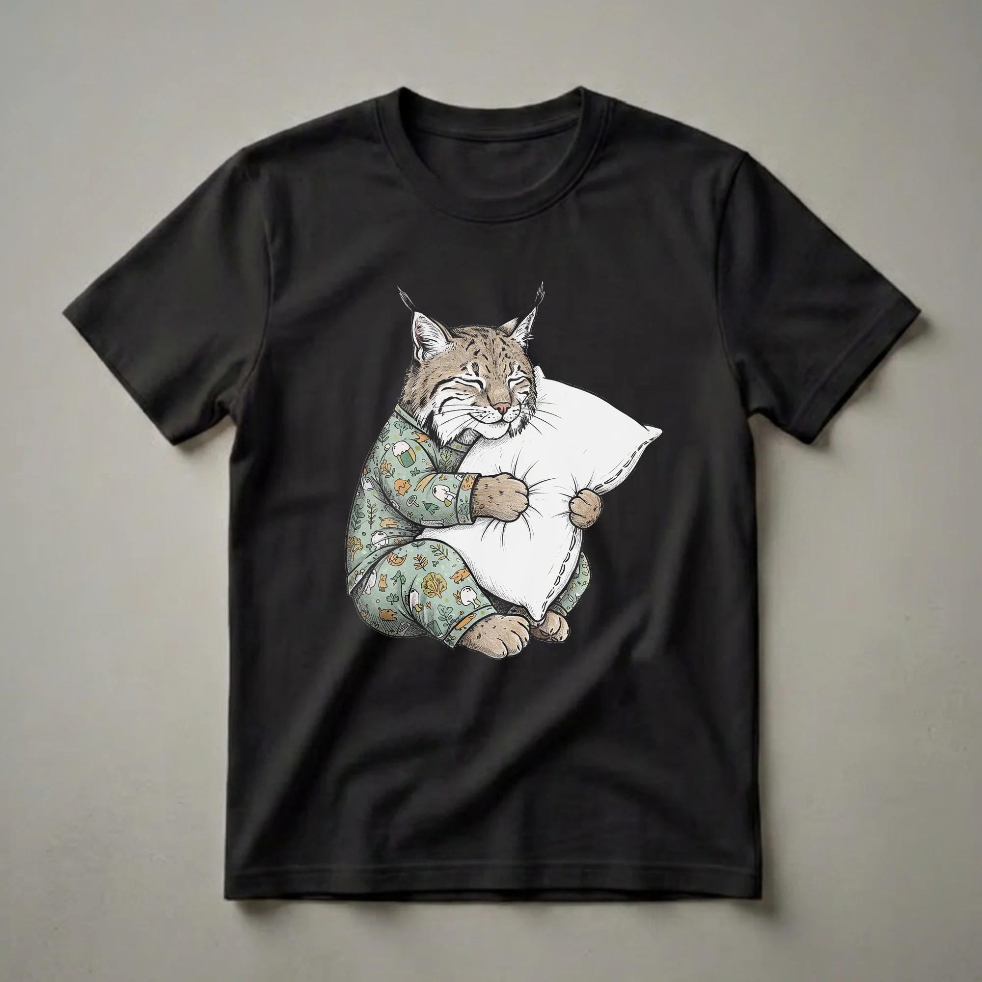 Bobcats, known for their elusive nature and distinctive ear tufts, are often depicted as solitary hunters of the North American wilderness. However, this graphic tee offers a whimsical twist, showcasing a bobcat in a state of ultimate relaxation. Dressed in a charming pajama set adorned with a playful pattern of mushrooms, leaves, and tiny woodland creatures, this feline is blissfully embracing a large, fluffy pillow. The art style features a hand-drawn, sketch-like quality with subtle coloring, giving it a unique, artistic appeal. This t-shirt is a delightful choice for anyone who appreciates a good laugh and a cozy vibe. It's a staple in the collection for those who identify with the desire for a long, uninterrupted nap. This tee works well for individuals who love cats, especially those who find the idea of a wild animal enjoying simple comforts endearing. Imagine gifting this to a friend who constantly talks about their need for more sleep or a family member who adores all things feline. It’s a perfect conversation starter for casual gatherings or a comfortable choice for lounging at home. The playful design captures the essence of comfort and humor, making it a go-to tee for relaxation and lighthearted fun.