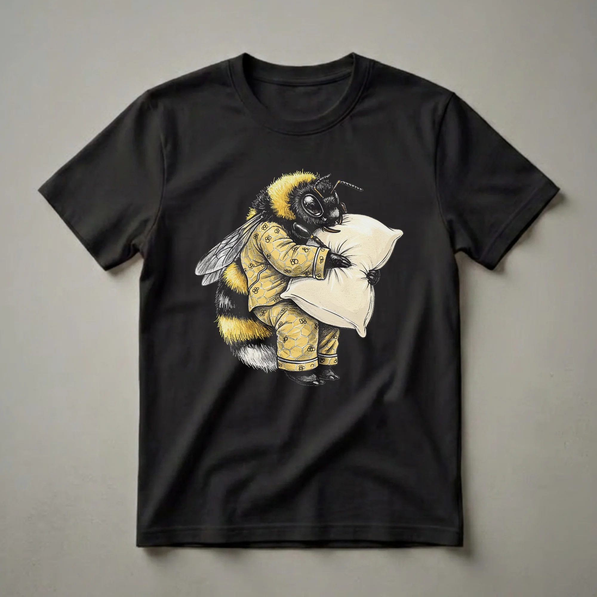 - The graphic tee showcases a detailed bumblebee with a honeycomb pajama pattern.