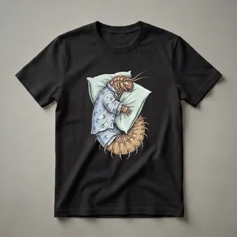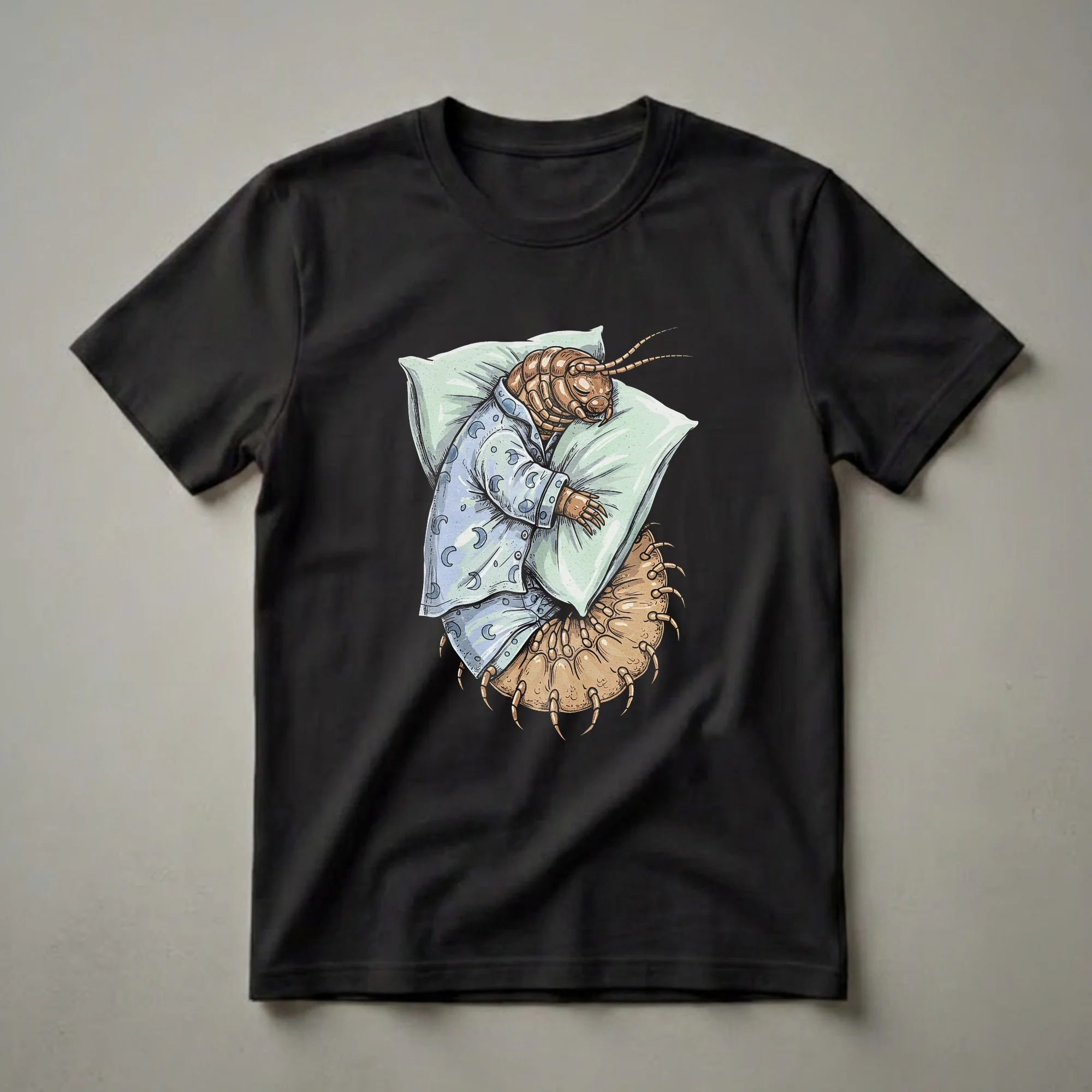 Centipedes, known for their segmented bodies and numerous legs, are often depicted as fast-moving creatures. However, this graphic tee flips that perception, showcasing a centipede in a state of deep slumber. The artwork features a detailed illustration of a centipede comfortably nestled between two soft, light-green pillows, wearing light blue pajamas adorned with crescent moons and circles. Its eyes are closed, and its many legs are tucked in, conveying a sense of peaceful rest. This humorous design is a playful take on the arthropod world, a thoughtful choice for those who appreciate unique and quirky art. It's a staple in any collection for individuals who identify with the need for extra sleep or simply enjoy a good laugh. This t-shirt makes a thoughtful gift for friends or family members who are always tired, love insects, or appreciate a touch of the absurd in their wardrobe. Imagine wearing this to a casual game night or a relaxed brunch, sparking conversations and smiles. It’s a go-to tee for anyone who believes that even the most active creatures deserve a good night's rest. The detailed illustration captures the essence of a creature that, despite its many legs, is clearly ready to hit the hay.