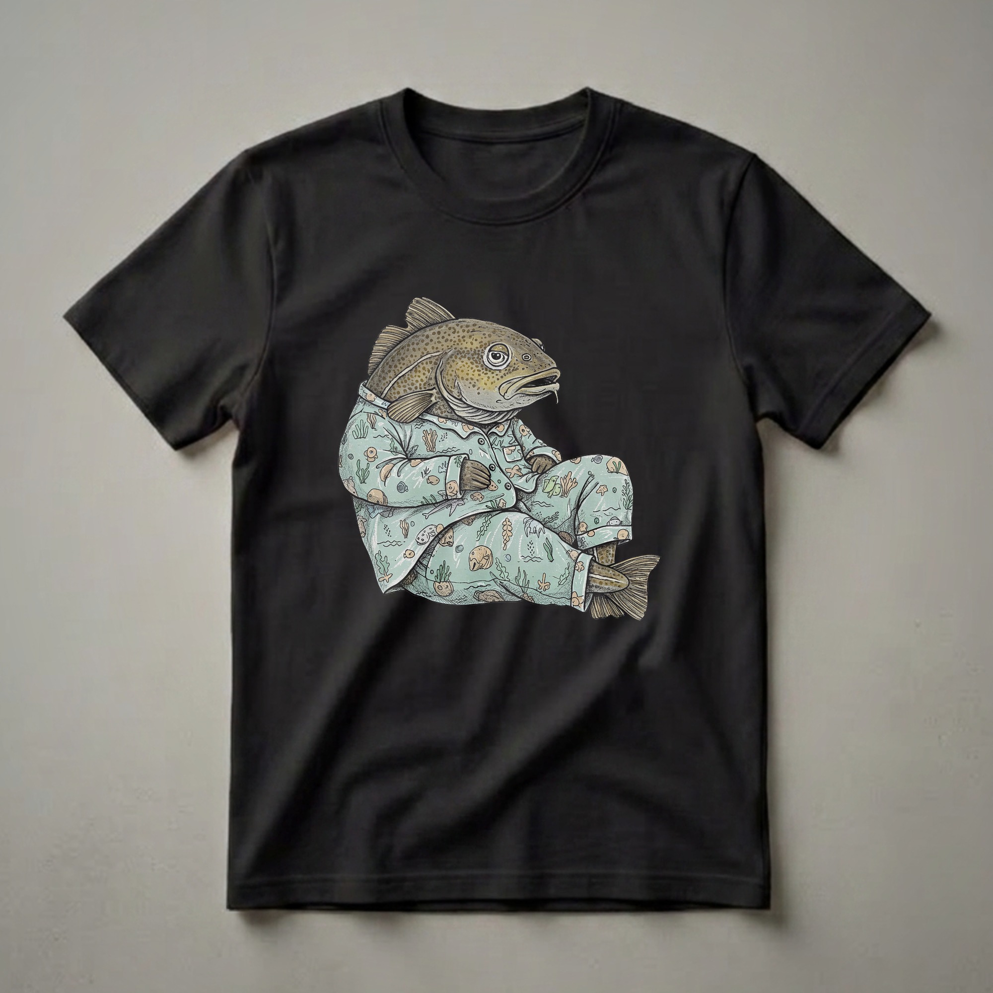 Anglers who appreciate a good laugh will reach for this unique graphic tee featuring a sleepy cod fish. This eye-catching design showcases a cod, identifiable by its mottled brown and green coloration and distinctive barbel, dressed in a light blue pajama set. The pajamas are adorned with a whimsical pattern of various sea creatures, including smaller fish, starfish, shells, and aquatic plants, evoking the fish's natural habitat. Cod are bottom-dwelling fish found in cold-water marine environments, particularly abundant in the North Atlantic. They are a popular catch for recreational and commercial fishing, known for their mild, flaky white flesh. This t-shirt is a thoughtful gift for the fisherman in your life who understands the quiet moments of waiting by the water or the cozy feeling of winding down after a day of angling. It’s a comfortable shirt to wear while relaxing at home, dreaming of the next big catch, or even to a casual fishing trip gathering. This shirt celebrates the humor found in the fishing world and the love for the sport.