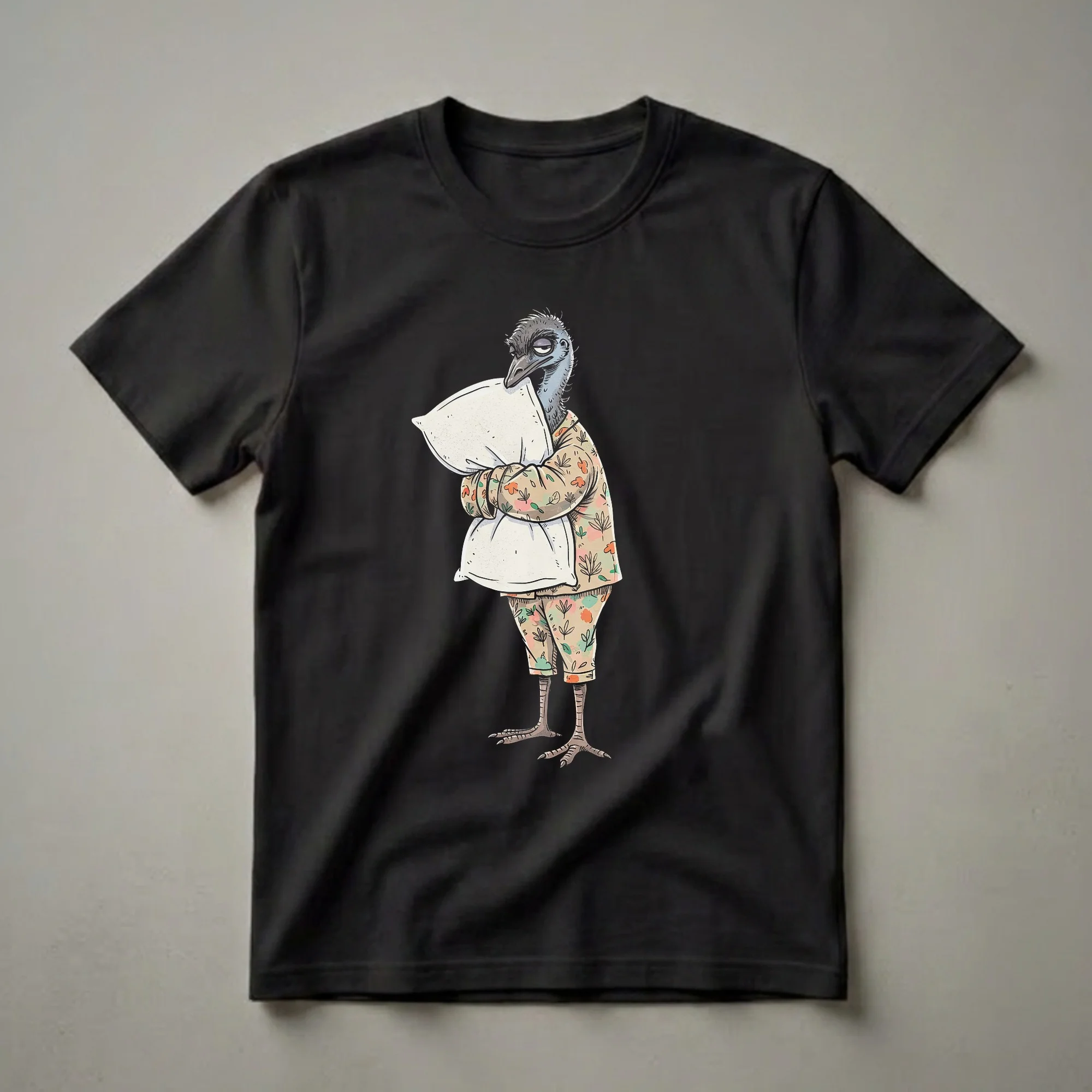 Emus, native to Australia, are the second-largest living birds by height, surpassed only by their ratite relatives, the ostriches. This striking graphic tee features a cartoon emu looking utterly exhausted, clutching a plush pillow as if it's the only thing keeping it upright. The emu is depicted wearing a full pajama set adorned with a whimsical floral and leaf pattern in shades of beige, coral, and green. Its eyes are half-closed, conveying a universal feeling of morning grogginess or the desire for just five more minutes of sleep. This t-shirt is a humorous nod to anyone who identifies with the struggle of waking up or the pure joy of a cozy night's rest. It's a staple in the collection for those who appreciate a good laugh and a comfortable shirt. This tee works well for men and women who love animals, especially unique birds, or for kids who find the idea of a sleepy emu amusing. It makes a thoughtful gift for friends or family members who are always tired, love to sleep in, or appreciate quirky, funny designs. Imagine wearing this to a casual game night or while lounging around the house on a lazy weekend morning.