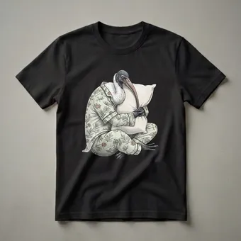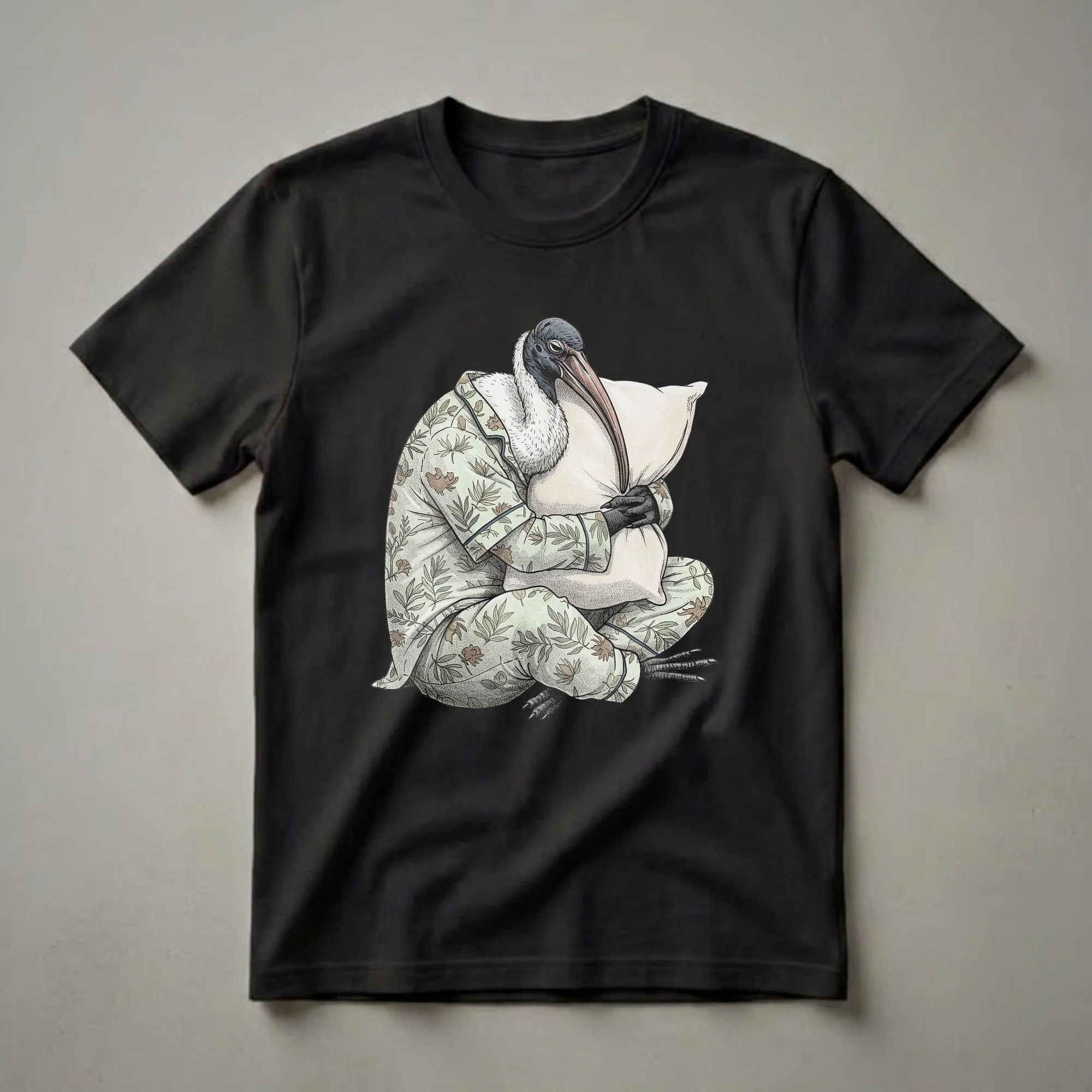 Ibis owners and bird enthusiasts who appreciate a good laugh will reach for this unique graphic tee. The illustration showcases a striking ibis bird, known for its long, curved beak and distinctive plumage, depicted in a whimsical scene. This particular ibis is dressed in a charming pajama set adorned with a delicate botanical print of leaves and flowers in muted green and brown tones. It's shown sitting cross-legged, embracing a fluffy pillow, with its head tilted as if caught in a moment of deep slumber or longing for one. The artistic style, with its textured shading and bold outlines, gives the image a vintage yet playful feel. Ibises are wading birds found in various parts of the world, often near wetlands and marshes, where they forage for food. This shirt captures a relatable human sentiment, the desire for rest and comfort, and applies it to an unexpected subject, making it a conversation starter. It makes a thoughtful gift for anyone who loves birds, enjoys quirky humor, or simply understands the universal appeal of a cozy nap. Wear this tee to your next casual gathering or simply lounge in it at home.