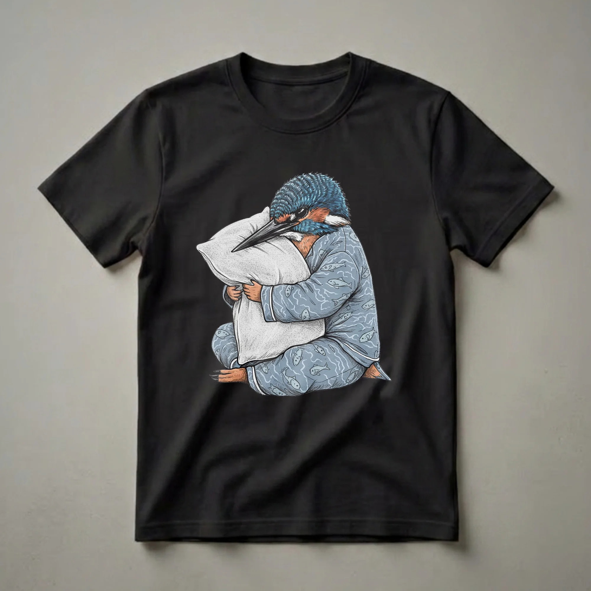 Kingfisher owners and bird enthusiasts who appreciate a good laugh will reach for this unique graphic tee. The design showcases a detailed illustration of a kingfisher bird, complete with its striking blue and orange plumage, dressed in a blue pajama set adorned with a playful fish pattern. The bird is depicted in a cozy, sleepy pose, tightly hugging a fluffy white pillow, embodying the universal desire for rest. Kingfishers are known for their vibrant colors and their incredible diving skills to catch fish, making this pajama-clad depiction a humorous contrast to their active nature. This shirt is a thoughtful gift for anyone who loves birds, enjoys a bit of whimsy, or simply understands the joy of a comfortable sleep. It's a conversation starter, a thoughtful choice for casual outings, game nights, or simply lounging around the house. The detailed artwork captures the essence of both the bird and the sleepy mood, making it a standout piece in any casual wardrobe. This tee is a go-to for those who want to express their quirky side.