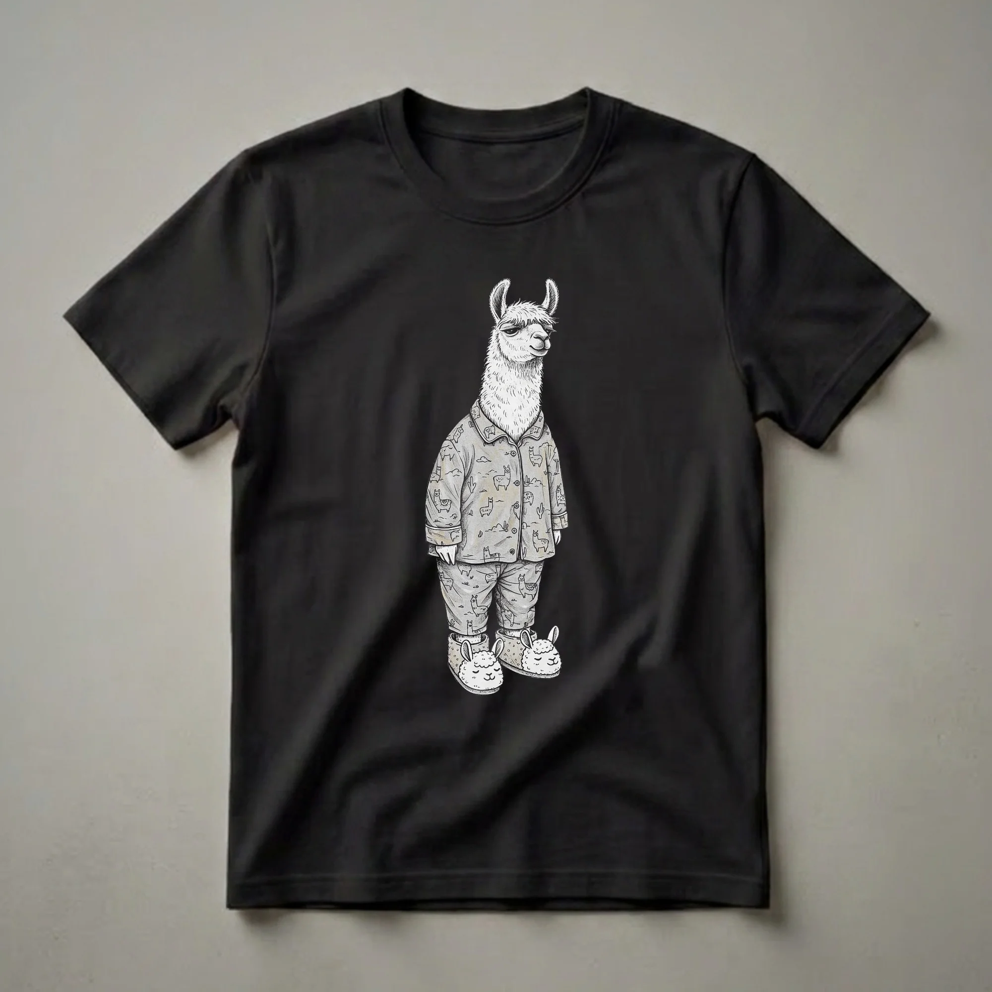 Women and girls who appreciate a good laugh will reach for this humorous llama pajama tee. The design features a stylized, slightly grumpy-looking llama dressed in a full pajama set, complete with matching slippers. The pajamas themselves are adorned with a whimsical pattern of smaller llamas, cacti, and abstract shapes, creating a playful and eye-catching print. Llamas, native to the Andes Mountains of South America, are known for their calm demeanor and distinctive appearance. This graphic shirt captures a relatable feeling of wanting to relax and unwind, making it a go-to tee for lounging around the house or enjoying a lazy morning. It makes a thoughtful gift for anyone who loves animals, humor, or simply enjoys comfortable and quirky sleepwear. Wear it to your next pajama party or simply to enjoy a cozy night in. This t-shirt is a fun addition to any sleepwear collection, offering both comfort and a unique style that's sure to bring a smile.