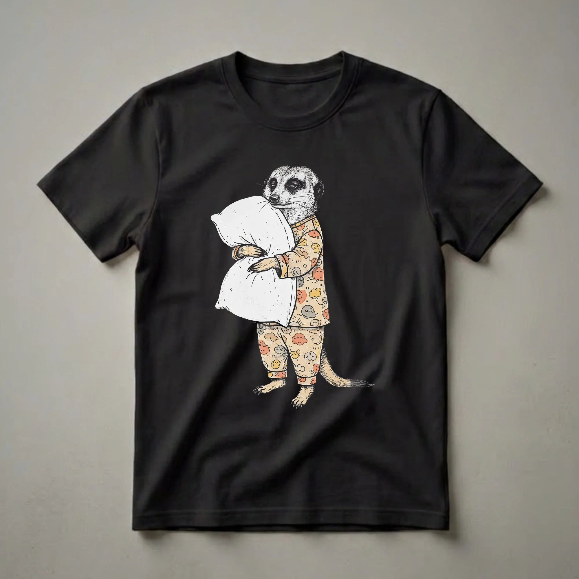 - This graphic tee features a sleepy meerkat in pajamas, a fun choice for animal lovers.