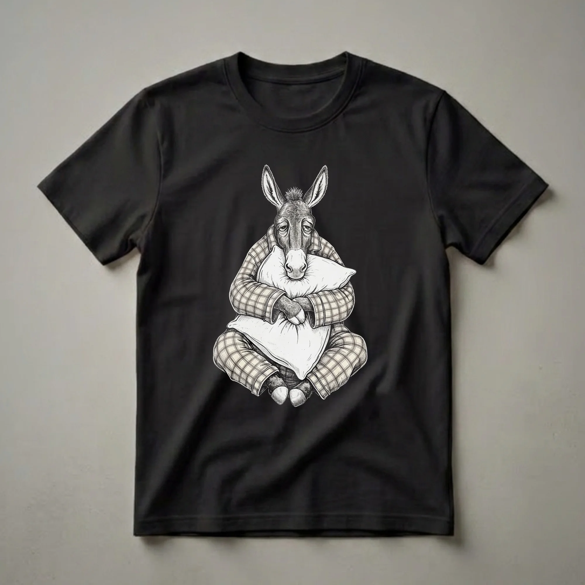 Mules, known for their endurance and gentle nature, are often depicted as hardworking animals. However, this striking graphic tee showcases a different side of these fascinating creatures. The detailed sketch features a mule dressed in classic plaid pajamas, complete with a matching sleep cap, looking utterly exhausted. It's clutching a large pillow, its droopy eyes conveying a universal desire for sleep. This t-shirt is a humorous nod to those days when even the most resilient among us just want to stay in bed. It's a staple in the collection for anyone who appreciates a good laugh and a touch of whimsy. This shirt works well for anyone who identifies with the struggle of waking up or simply enjoys unique, artistic apparel. It makes a thoughtful gift for friends or family members who have a great sense of humor and a fondness for farm animals or quirky designs. Imagine wearing this tee to a casual game night or a relaxed brunch, sparking smiles and conversations. The detailed linework and the relatable depiction of exhaustion make this a truly memorable piece of clothing.