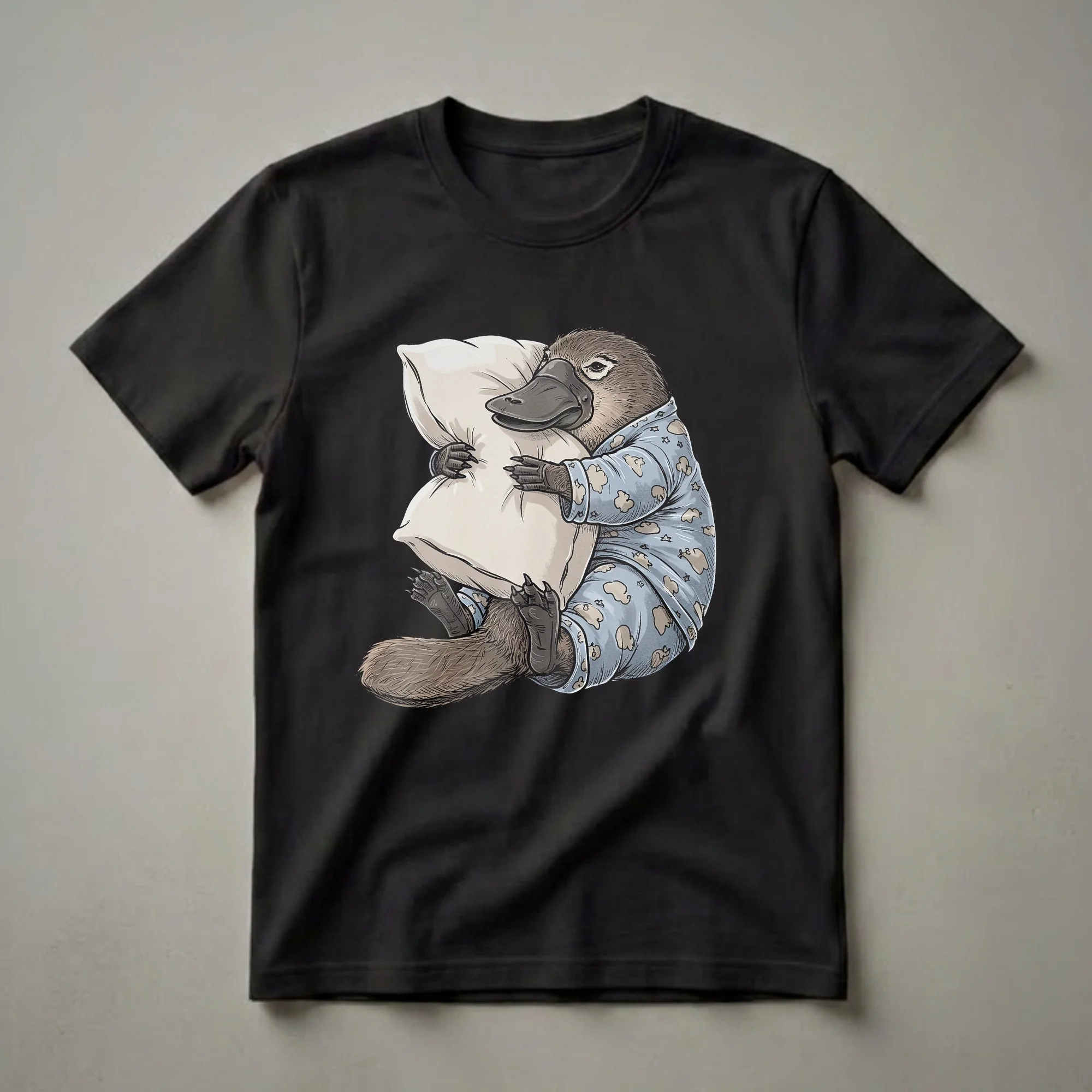 Platypus owners and fans of unique Australian wildlife will reach for this tee. The platypus, a semi-aquatic mammal native to eastern Australia, is known for its duck-like bill, beaver-like tail, and otter-like feet. This graphic t-shirt showcases a charming illustration of a platypus dressed in light blue pajamas adorned with clouds and stars, tightly hugging a fluffy white pillow. Its eyes are closed, conveying a sense of deep sleep or a desire for rest. This pajama-themed platypus shirt is a playful choice for those who appreciate a good night's sleep or simply enjoy whimsical animal art. It makes a thoughtful gift for friends or family members who love platypuses, unique creatures, or have a penchant for cozy sleepwear. Wear this t-shirt to bed, on lazy weekend mornings, or to a casual pajama party to express your love for all things sleepy and cute. The design captures the essence of comfort and the endearing nature of this fascinating monotreme. This shirt is a fun way to celebrate your love for animals and relaxation.