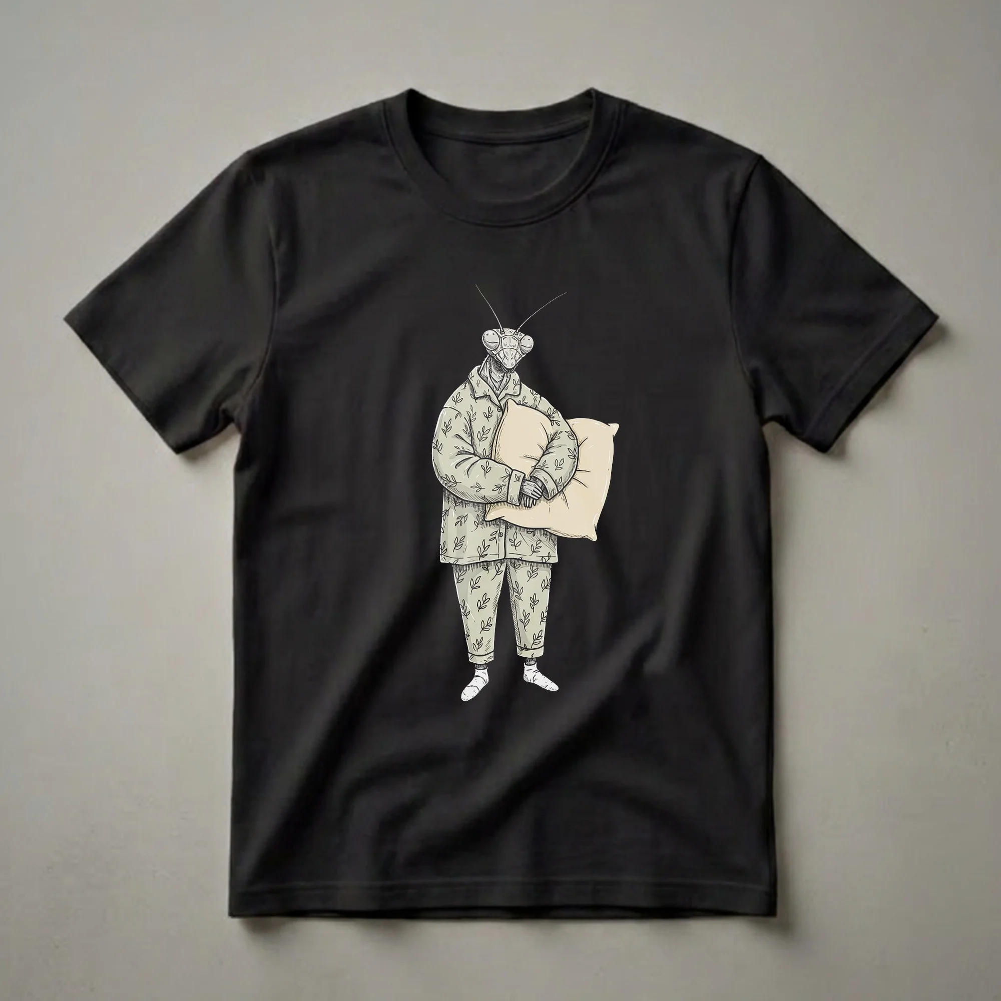 Insect lovers and pajama enthusiasts will adore this charming graphic tee featuring a sleepy, pajama-clad praying mantis ready for bed. This graphic tee captures a whimsical side of these creatures, depicting one in a cozy, leaf-patterned pajama set, complete with socks and a pillow. The illustration style is reminiscent of vintage sketches, giving it a unique, artistic appeal. This t-shirt is a playful nod to the desire for rest and relaxation, even for the most active of insects. It's a staple in the collection for anyone who appreciates the humor in everyday situations, or for those who simply love a good night's sleep. This shirt works well for entomology students, nature lovers, or anyone who finds the idea of a sleepy mantis amusing. It makes a thoughtful gift for friends or family members who enjoy quirky designs and a touch of the unexpected. Imagine wearing this tee to a casual game night or a relaxed brunch, sparking conversations about insects and the universal need for comfort. This pajama-themed praying mantis shirt is a conversation starter and a comfortable addition to any casual wardrobe.