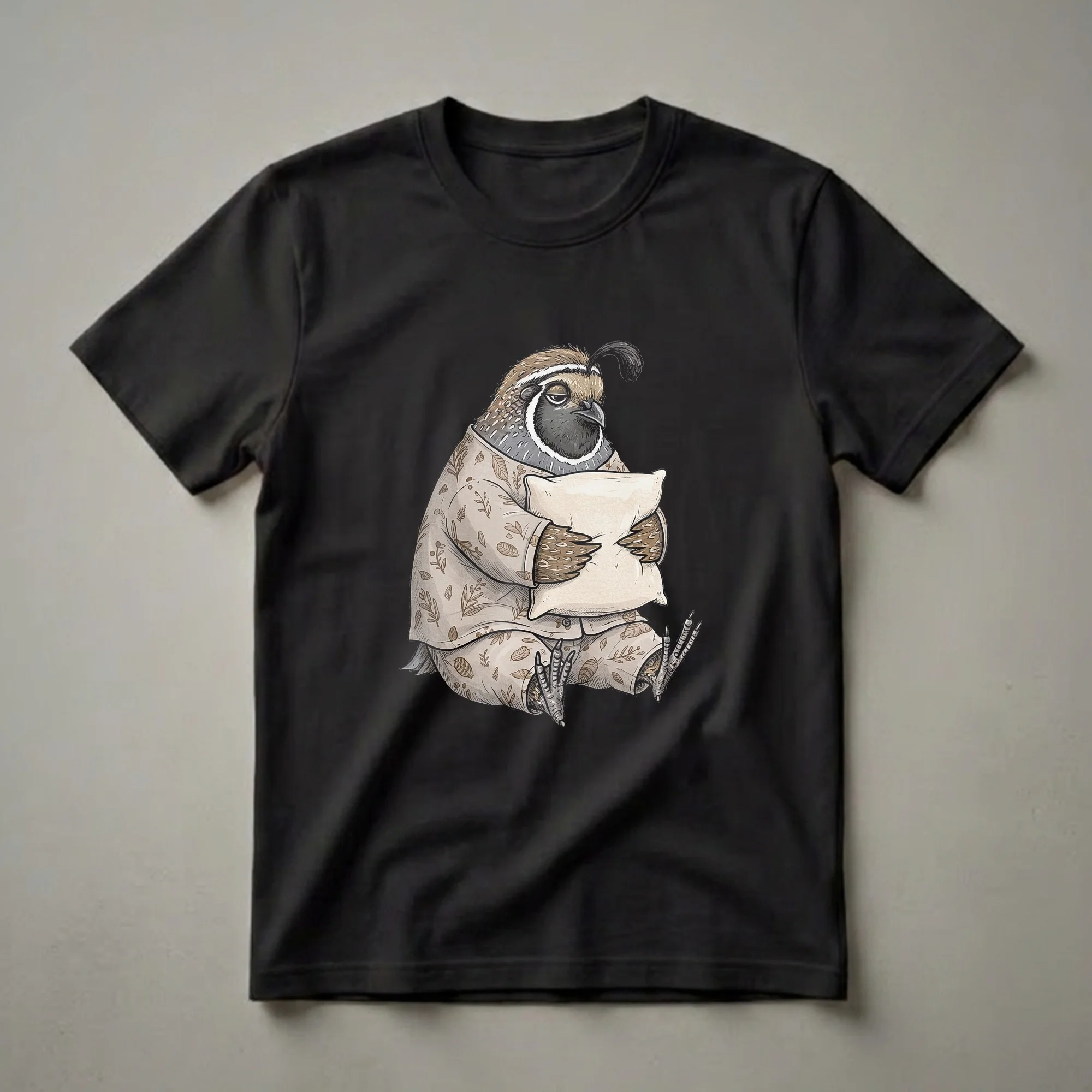 Quail owners and bird enthusiasts who appreciate a good laugh will reach for this unique graphic tee. The design showcases a charmingly weary quail, depicted in a sketchy, watercolor style, complete with a fluffy crest and tired eyes. This little bird is dressed in a cozy pajama set adorned with a delicate botanical print of leaves and sprigs, and it's clutching a soft pillow, clearly ready for a nap. The detailed rendering of its feathers and scaly feet adds to the whimsical charm of this apparel. Quail are known for their distinctive calls and their habit of roosting in coveys, often on the ground, making this depiction of a sleepy quail relatable to anyone who loves these ground-dwelling birds. This t-shirt makes a thoughtful gift for friends or family members who adore birds, appreciate quirky humor, or simply enjoy the comfort of pajamas. It's a perfect conversation starter for casual outings, game nights, or just lounging around the house.