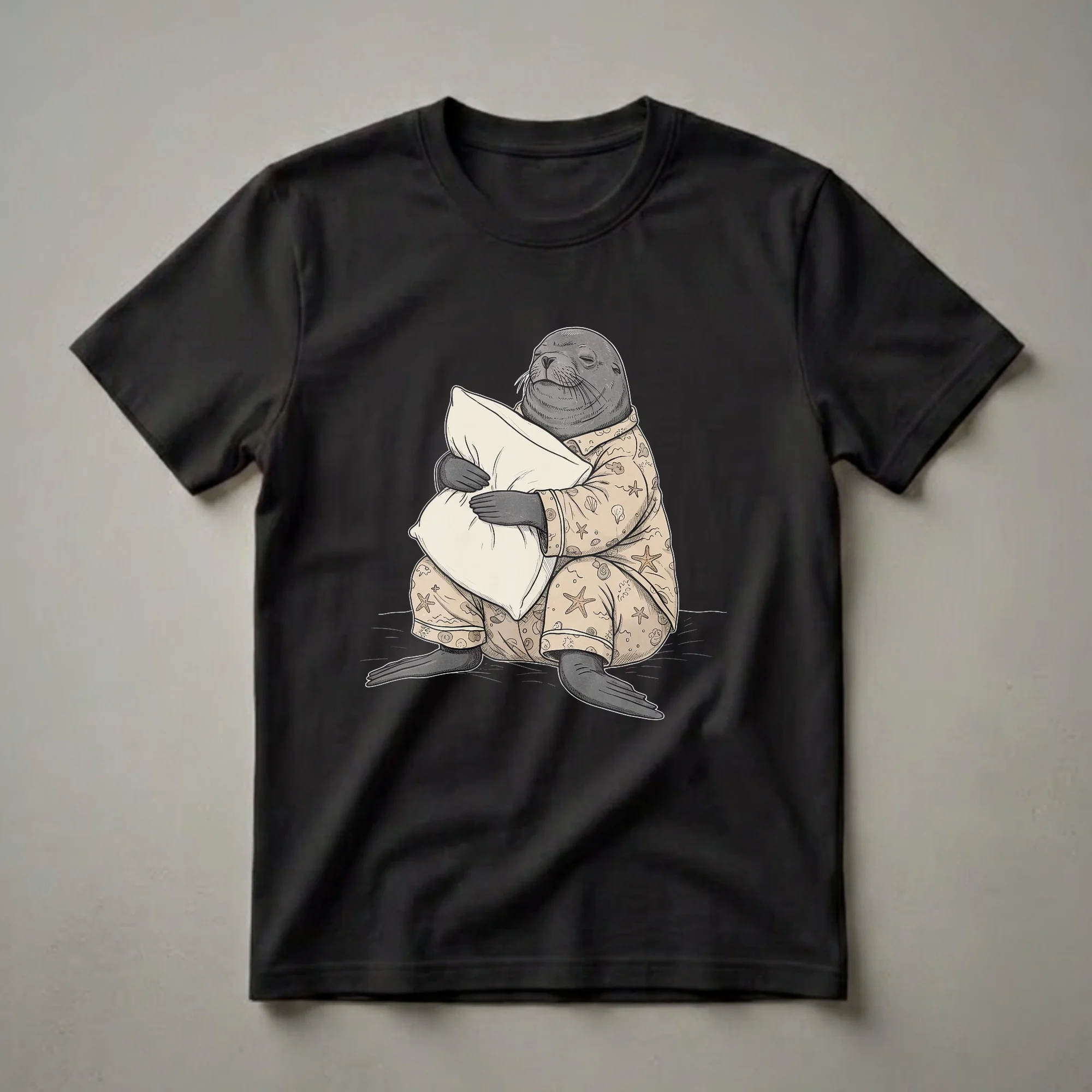 Sea lions, known for their playful nature and distinctive barks, often spend significant time resting and sleeping, sometimes even on their backs with flippers in the air. This humorous graphic tee captures that spirit of relaxation with a charming illustration of a sea lion dressed in pajamas and cozily embracing a pillow. The pajama set itself is adorned with a whimsical pattern of seashells and starfish, hinting at the sea lion's natural habitat. This t-shirt is a delightful choice for anyone who appreciates a good nap or finds humor in animal antics. It makes a thoughtful gift for friends or family members who identify as night owls or simply enjoy a laid-back lifestyle. Imagine wearing this comfortable shirt to a casual game night or while lounging at home on a lazy Sunday morning. It’s a conversation starter and a wearable declaration of love for sleep and sea creatures alike. This unique shirt is sure to bring a smile to your face and to those around you, celebrating the joy of a peaceful slumber.