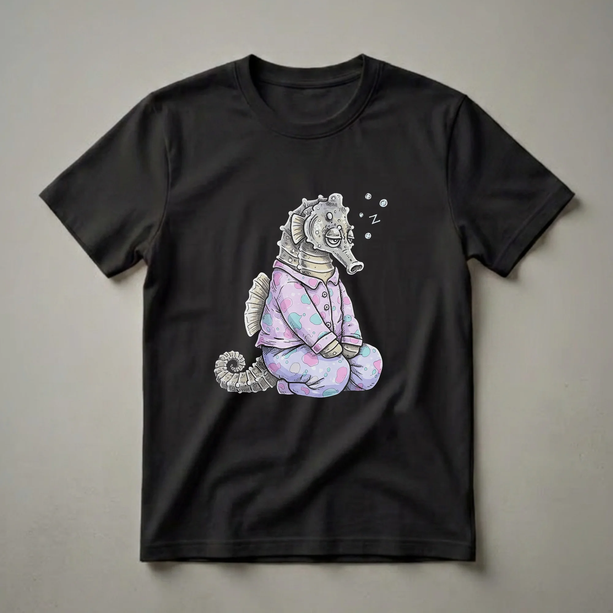Seahorses, known for their unique upright posture and gentle nature, often appear to be in a state of calm. This graphic tee captures that serene, sleepy vibe with a whimsical twist. The illustration features a seahorse dressed in a pastel pink and blue polka-dot pajama set, complete with a collared shirt and matching pants. Its eyes are closed, and Z's float above its head, indicating a deep slumber. This eye-catching design is a thoughtful choice for anyone who appreciates a good nap or finds humor in the everyday struggles of staying awake. The seahorse's coiled tail and intricate body details are rendered in a charming, hand-drawn style, making this more than just a pajama shirt; it's a wearable piece of art. This t-shirt makes a thoughtful gift for girls and women who love marine life, enjoy a good laugh, or simply appreciate comfortable, fun apparel. Imagine wearing this tee while lounging at home, enjoying a lazy weekend morning, or even to a casual pajama party. It’s a go-to tee for anyone who identifies with the feeling of being utterly exhausted but still cute. The playful design and comfortable feel make it a staple for relaxation time.