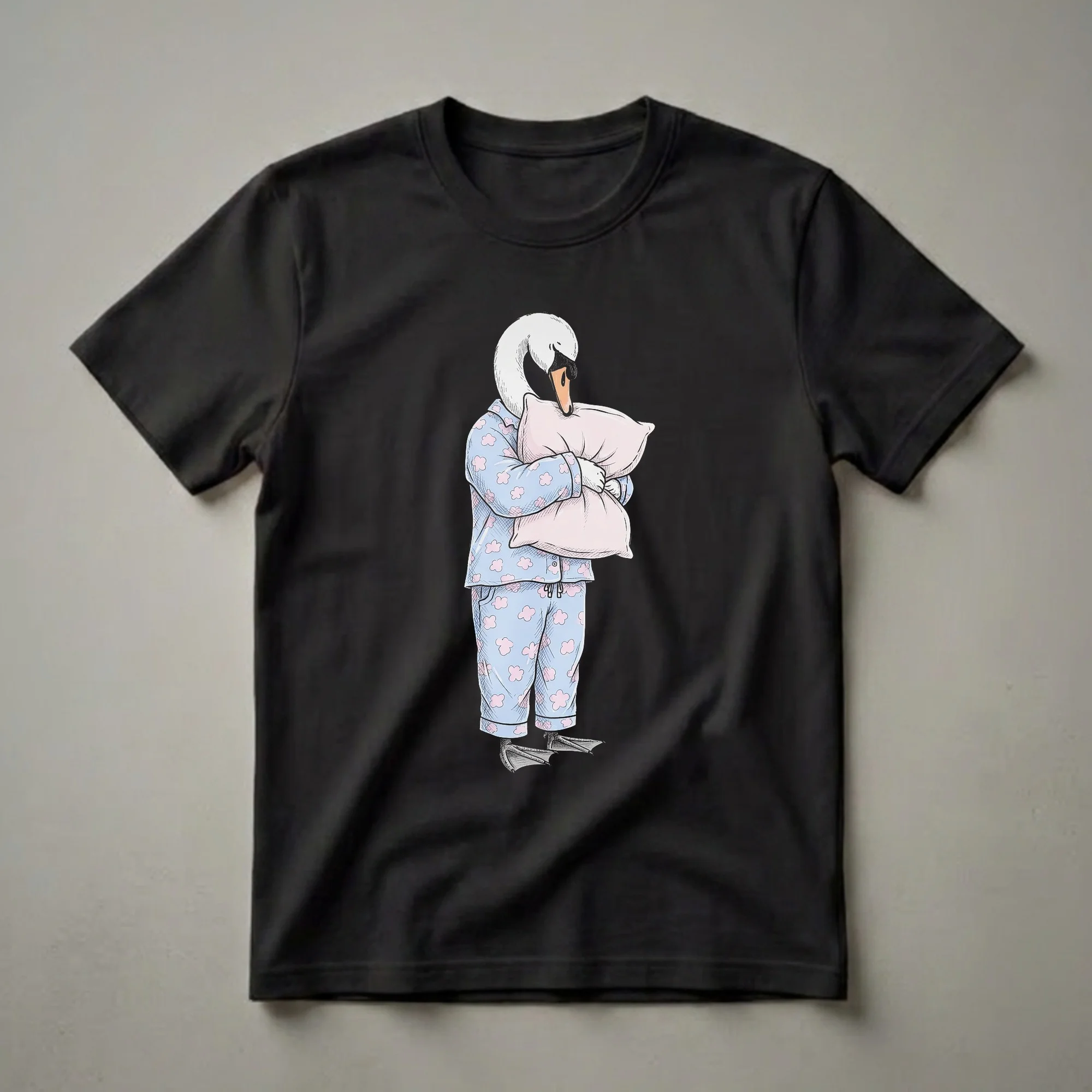 Sleepy swan owners who appreciate a good nap will reach for this eye-catching tee. This graphic shirt features a charming cartoon swan, depicted in a whimsical sketch style, dressed in light blue pajamas adorned with pink cloud patterns. The swan is shown embracing a soft pink pillow, its eyes gently closed, embodying the ultimate state of relaxation. Swans, known for their grace and serene presence on water, are often associated with tranquility, making this shirt a fitting tribute to those who cherish their downtime. This t-shirt is a thoughtful gift for anyone who loves to sleep, enjoys quirky animal designs, or identifies as a night owl or early bird who just needs more rest. It's a fun way to express a love for slumber and a playful nod to the comfort of pajamas. Wear this tee to your next pajama party, a casual brunch, or simply while enjoying a lazy morning at home. It’s a staple in the collection for those who believe that a good night's sleep is essential for well-being. This shirt is a go-to tee for anyone who loves to snuggle up and drift off into dreamland, making it a unique addition to any casual wardrobe.