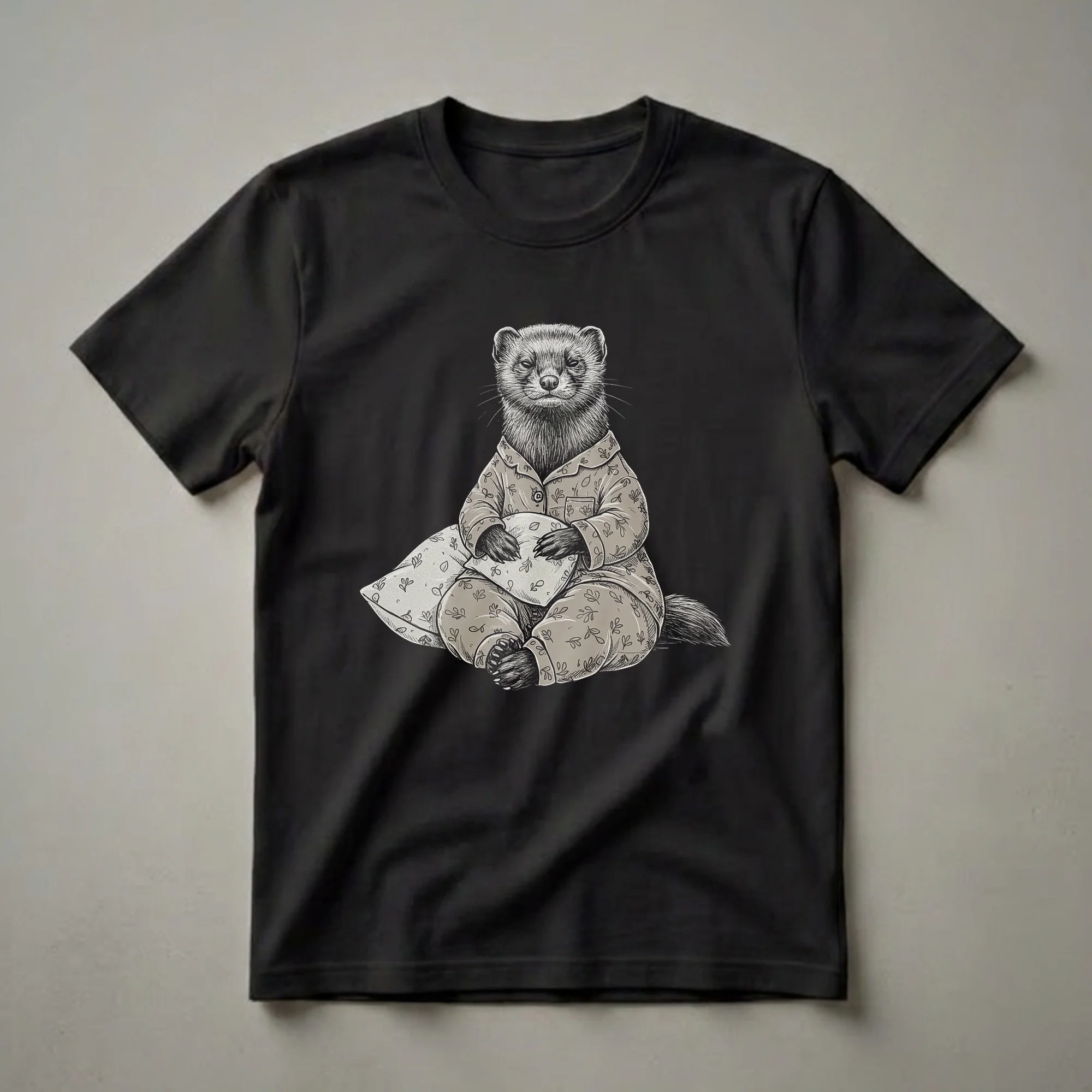 Weasels, known for their slender bodies and energetic nature, are depicted here in a surprisingly relaxed pose. This graphic tee showcases a detailed sketch of a weasel dressed in a button-up pajama set adorned with a subtle leaf pattern. The creature is seated, cradling a matching pillow, its eyes half-closed, conveying a strong sense of sleepiness and comfort. This unique design captures the humorous contrast between the weasel's typically active lifestyle and the universal desire for rest. It's a staple in the collection for anyone who appreciates quirky animal art or identifies with the need for a good night's sleep. This shirt works well for men and women who enjoy a good laugh and unique apparel. It makes a thoughtful gift for friends or family members who are animal enthusiasts or simply love cozy loungewear. Imagine wearing this tee on a lazy weekend morning or during a relaxed movie night at home, embracing the spirit of the sleepy weasel.