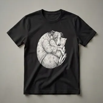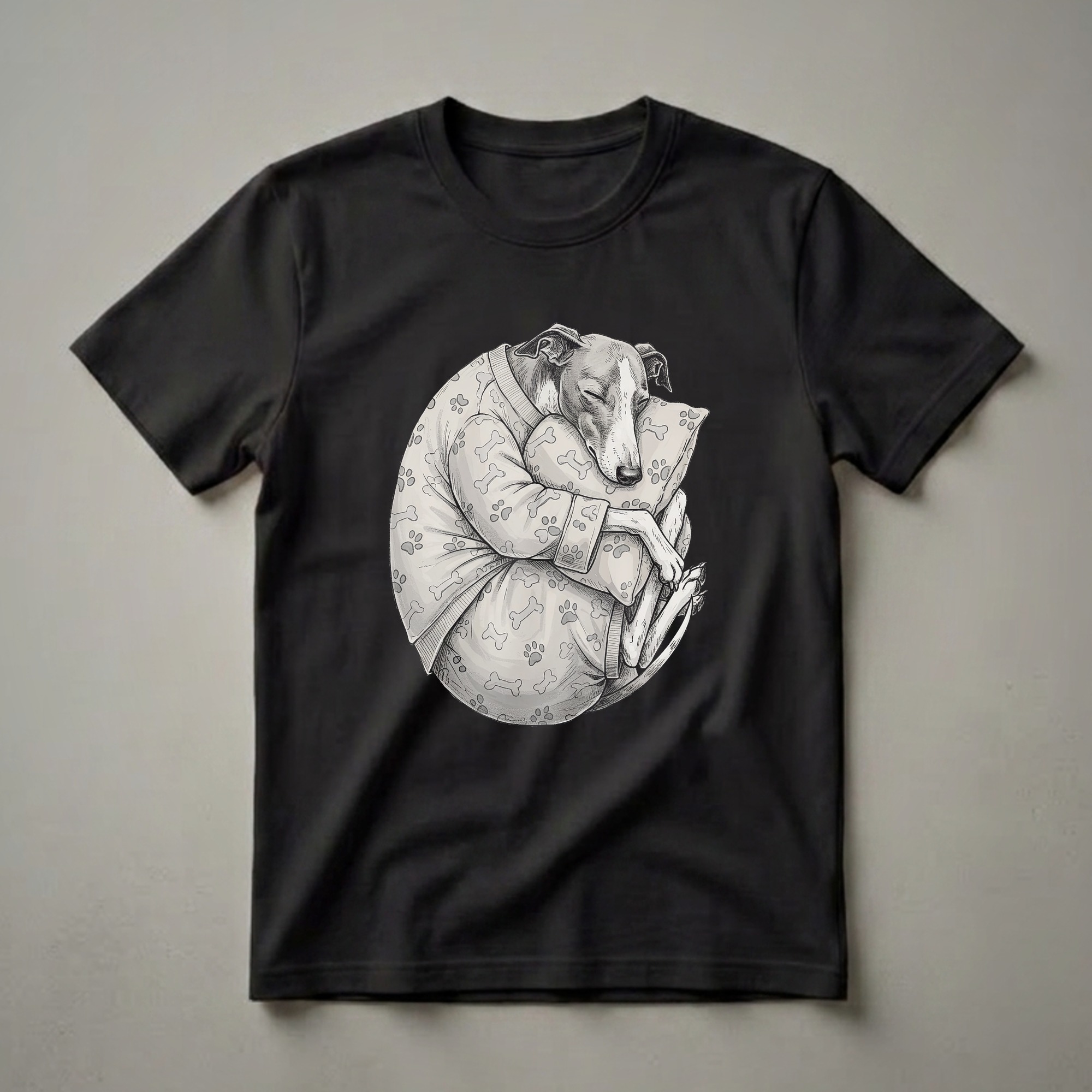 Whippet owners know the breed's elegant, slender build and their love for comfort and sleep. This eye-catching graphic tee captures that essence with a charming illustration of a whippet dog curled up soundly, embracing a pillow. The dog is depicted wearing pajamas adorned with a playful pattern of bones and paw prints, highlighting its cozy slumber. Whippets, known for their speed and gentle nature, often enjoy long naps, making this design relatable for anyone who cherishes their canine companions. This t-shirt is a thoughtful gift for the dog mom or dog dad in your life who appreciates a touch of humor and a lot of dog love. It's a staple in the collection for anyone who enjoys lounging at home or wants to showcase their affection for their sighthound. Wear this shirt to relax on the couch or to your next casual get-together, celebrating your favorite breed.