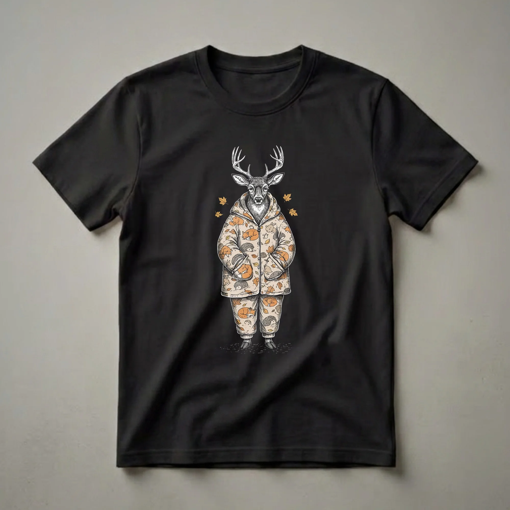 Woodland creatures know the importance of a good nap, and this pajama set captures that sleepy spirit perfectly. The design features a dapper deer, complete with impressive antlers, sporting a cozy pajama set adorned with a charming pattern. Scattered across the fabric are illustrations of sleeping foxes curled up, industrious hedgehogs nestled in leaves, and adorable bunnies dozing peacefully. Autumn leaves in warm hues also drift across the design, evoking a sense of cozy hibernation. This t-shirt is a staple for anyone who appreciates the quiet charm of forest animals and the simple joy of a comfortable night's sleep. It's a thoughtful gift for the deer lover in your life, or for anyone who enjoys whimsical, nature-inspired apparel. Imagine lounging around on a lazy Sunday morning or settling in for a movie marathon wearing this unique and humorous pajama tee. The detailed illustration style brings these sleepy forest dwellers to life, making it a conversation starter and a delightful addition to any loungewear collection. This shirt is a go-to for relaxed evenings and lazy weekend mornings.