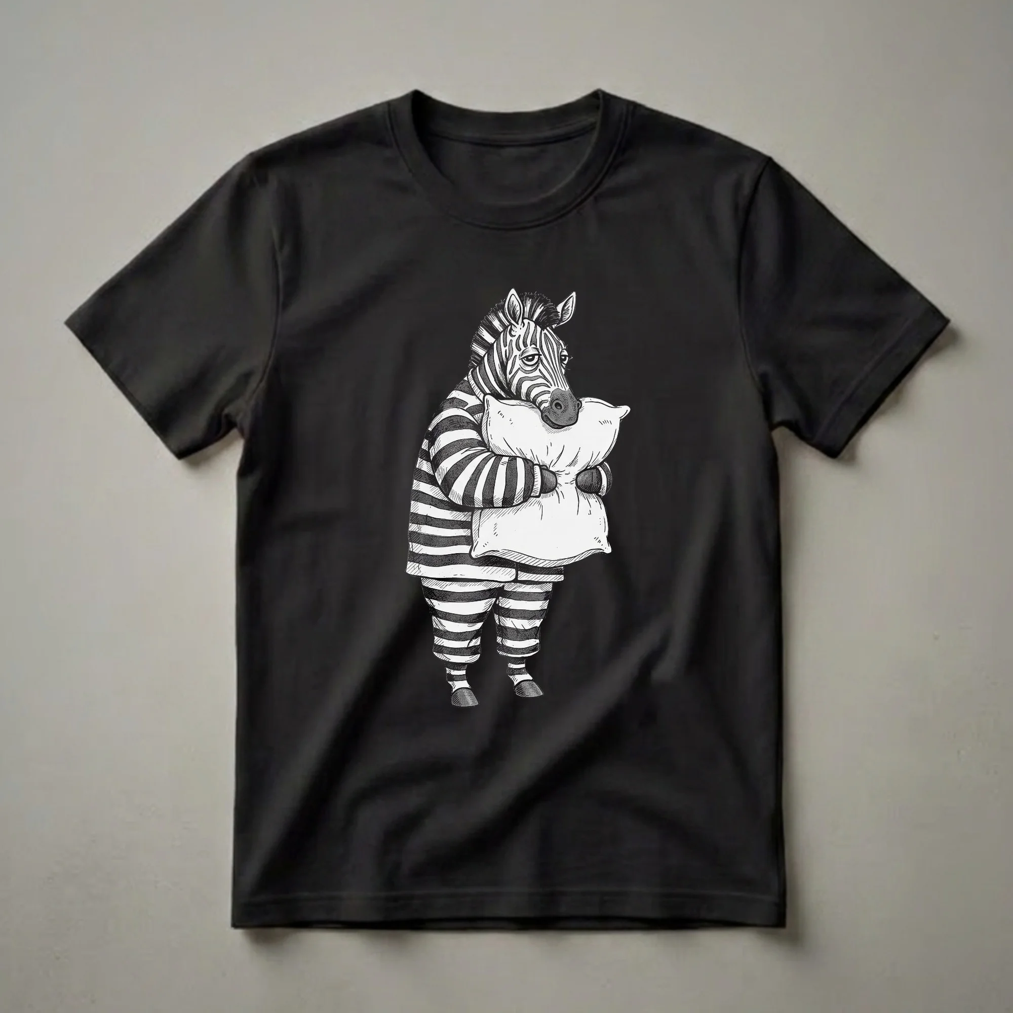 Zebra lovers and weary souls alike will adore this playfully sketched tee featuring a pajama-clad zebra clutching a pillow, ready for dreamland. While often depicted as energetic and wild, this graphic tee presents a humorous take on their potential for a good night's sleep. The artwork showcases a zebra dressed in striped pajamas, complete with a matching sleep mask over its eyes, and it's holding a fluffy pillow close. This eye-catching design is rendered in a sketch style, giving it a unique, artistic feel. It's a playful shirt that captures the universal desire for rest and relaxation. This t-shirt is a thoughtful gift for any zebra enthusiast, animal lover, or someone who appreciates a good dose of humor. It's the perfect apparel for lounging around the house, enjoying a lazy weekend morning, or even wearing to a casual pajama party. The visual gag of a zebra in sleepwear is sure to bring a smile to anyone's face, making it a go-to tee for those who enjoy quirky and fun designs. Whether you're buying for yourself or as a present, this shirt celebrates the lighter side of life and the simple joy of a cozy night's sleep.