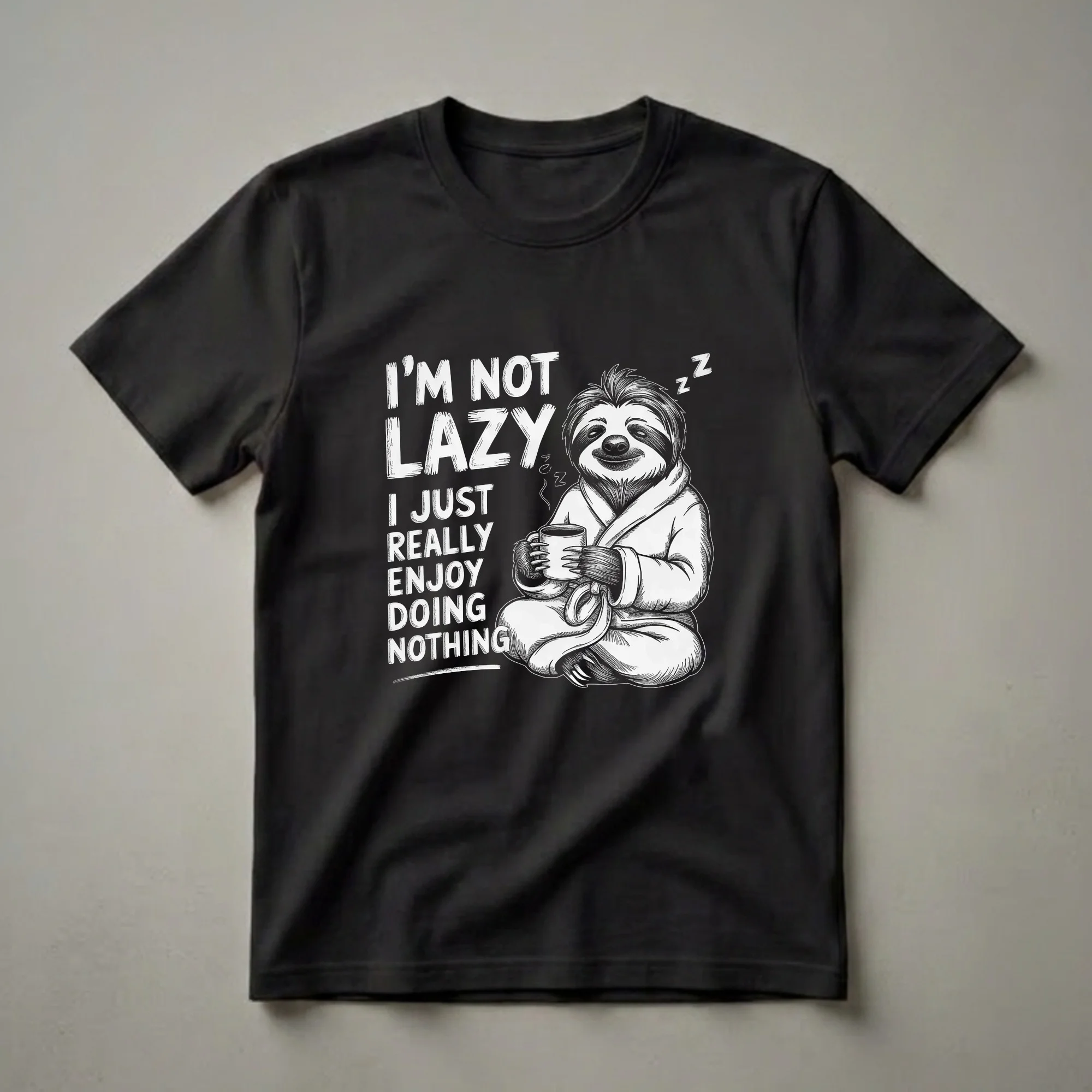 Sloths, known for their slow-moving nature, embody a lifestyle many aspire to. This humorous t-shirt captures that essence with a graphic of a relaxed sloth in a bathrobe, holding a steaming mug of coffee and sporting "zZz" symbols indicating sleep. The bold text reads, "I'M NOT LAZY, I JUST REALLY ENJOY DOING NOTHING." This eye-catching design is a fun statement piece for anyone who identifies with the sloth's leisurely pace. It's a staple in any collection for those who love a good laugh and a morning brew. The black and white sketch style gives this graphic tee a vintage yet modern appeal. This sloth shirt makes a thoughtful gift for friends or family who appreciate comfort and a bit of a slower pace in life, perhaps for a birthday or just because. It's a wearable reminder to savor moments of quiet enjoyment, making it a go-to tee for casual outings or relaxed evenings at home.