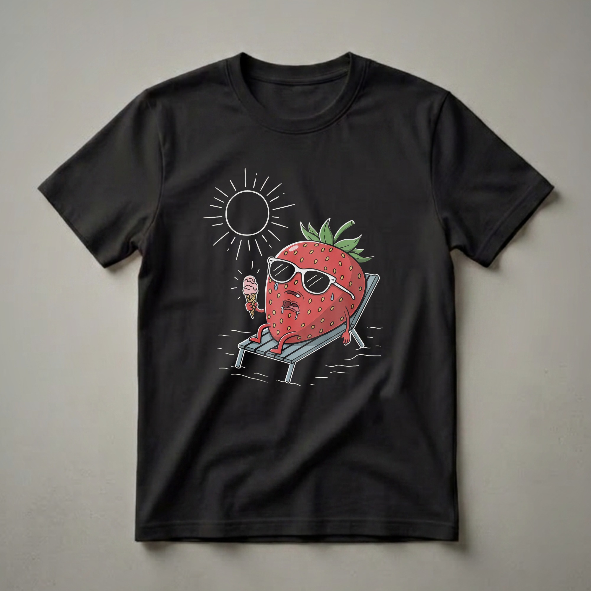Kids who love fruity characters will adore this whimsical t-shirt design. The graphic showcases a bright red strawberry, complete with seeds and green leaves, sporting cool white sunglasses. It's depicted sitting on a blue lounge chair, looking quite distressed as it holds a melting pink ice cream cone. Above, a stylized sun with rays beams down, emphasizing the heat. This tee captures the relatable struggle of enjoying a sweet treat on a sweltering summer day. Strawberries, scientifically known as Fragaria × ananassa, are a popular fruit enjoyed worldwide for their sweet flavor and vibrant color. This shirt makes a thoughtful gift for any child celebrating a summer birthday or for a young one who simply enjoys playful, food-themed apparel. It's a great choice for casual wear, beach trips, or birthday parties, bringing a smile to everyone who sees it. This fun graphic tee is sure to become a go-to item in any child's wardrobe.