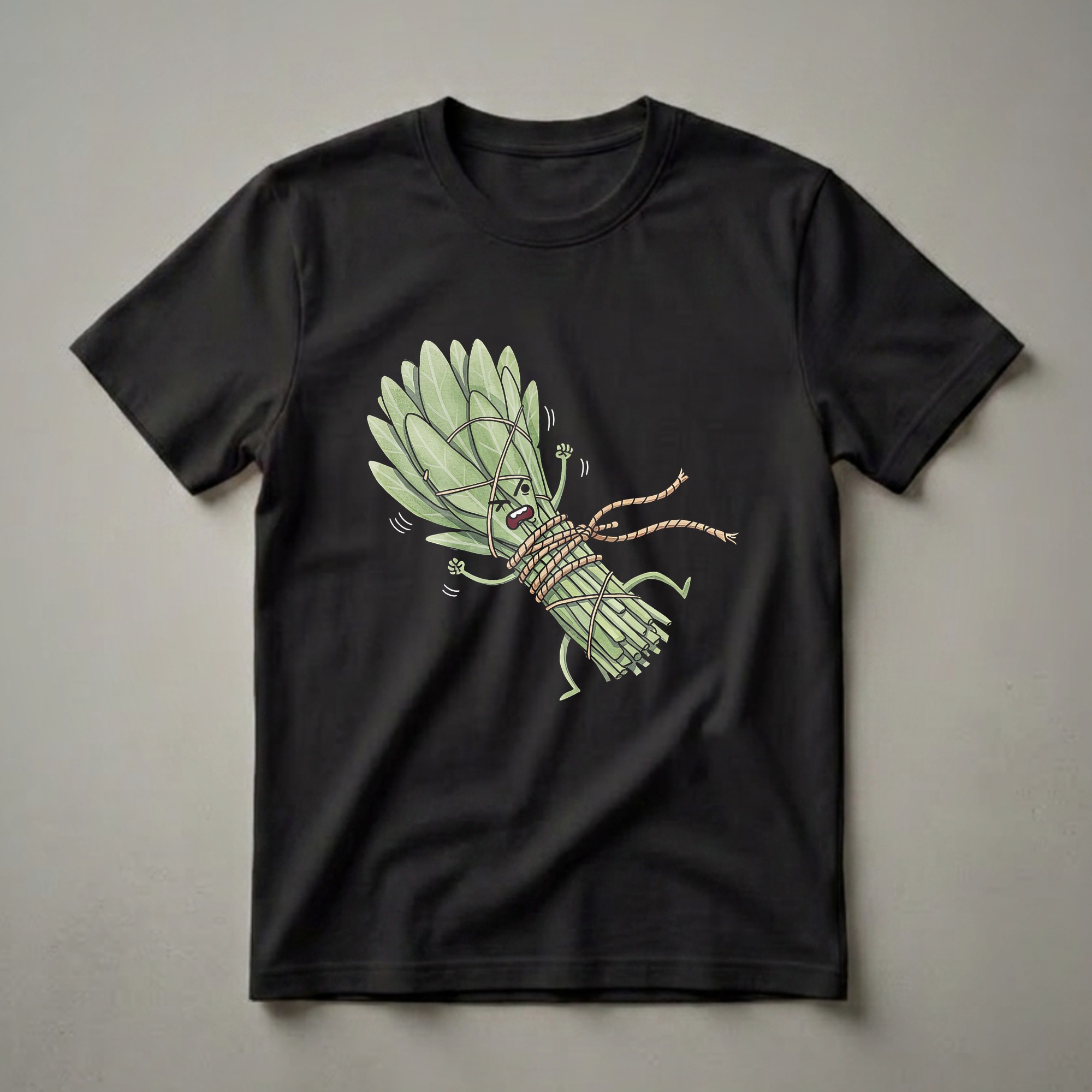 Sage bundles, often used for smudging and spiritual cleansing, are depicted here in a comical, anthropomorphic style. This graphic tee showcases a bundle of sage leaves, bound tightly with rope, with a distressed facial expression and flailing limbs, conveying a sense of struggle and humor. The artwork uses a watercolor-like texture with bold black outlines, giving it a unique artistic appeal. This shirt is a thoughtful choice for individuals who enjoy witty and unconventional humor, especially those with an interest in aromatherapy, natural remedies, or simply a good laugh. It makes a thoughtful gift for friends or family members who appreciate a touch of the absurd in their wardrobe. Imagine wearing this eye-catching tee to a casual get-together, a game night, or simply lounging at home. The visual gag of a sage bundle in distress is sure to spark conversations and bring smiles. This t-shirt is a staple for anyone looking to add a playful and memorable piece to their collection, celebrating the lighter side of everyday objects and practices. It's a conversation starter that highlights the fun in the unexpected, making it a go-to tee for those who love to express their personality through their clothing.
