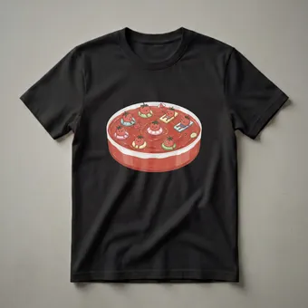 - Features a funny tomato pool party scene in gazpacho, a go-to tee for food pun lovers.