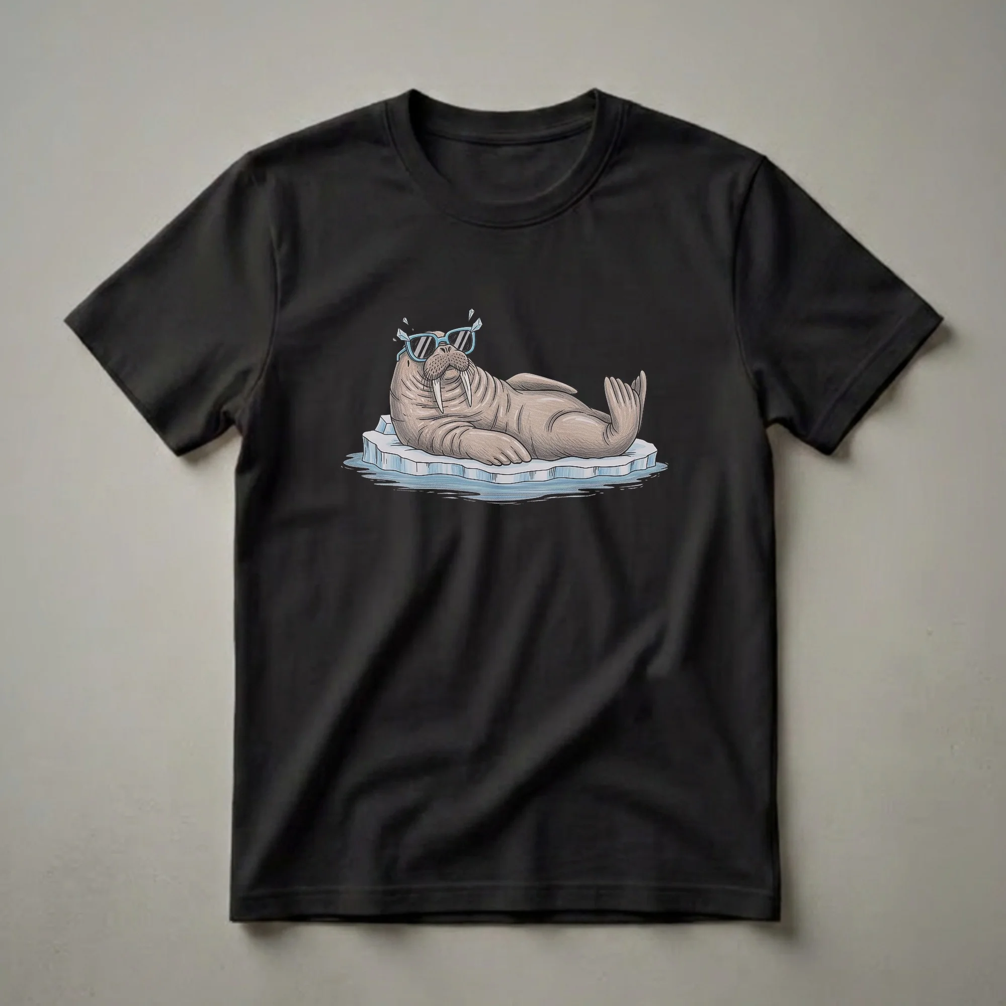 Walruses are marine mammals known for their large tusks and blubbery bodies, often found in the Arctic regions of the Northern Hemisphere. This eye-catching graphic tee features a humorous depiction of a walrus lounging on an ice floe, complete with cool blue sunglasses. The drawing style has a hand-sketched feel, with colored pencil textures adding depth to the walrus's skin and the icy environment. Tiny diamond-like shapes float near the sunglasses, adding a touch of sparkle and whimsy to the scene. This t-shirt is a fantastic choice for anyone who appreciates quirky animal humor and wants to add a playful statement piece to their wardrobe. It's a go-to tee for casual outings, game nights, or just relaxing at home. Makes a thoughtful gift for friends or family members who have a great sense of humor and a fondness for marine life or unique art. Imagine wearing this to a casual brunch or a get-together with friends, sparking conversations and smiles with its unique design.