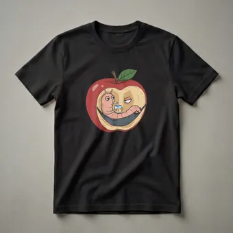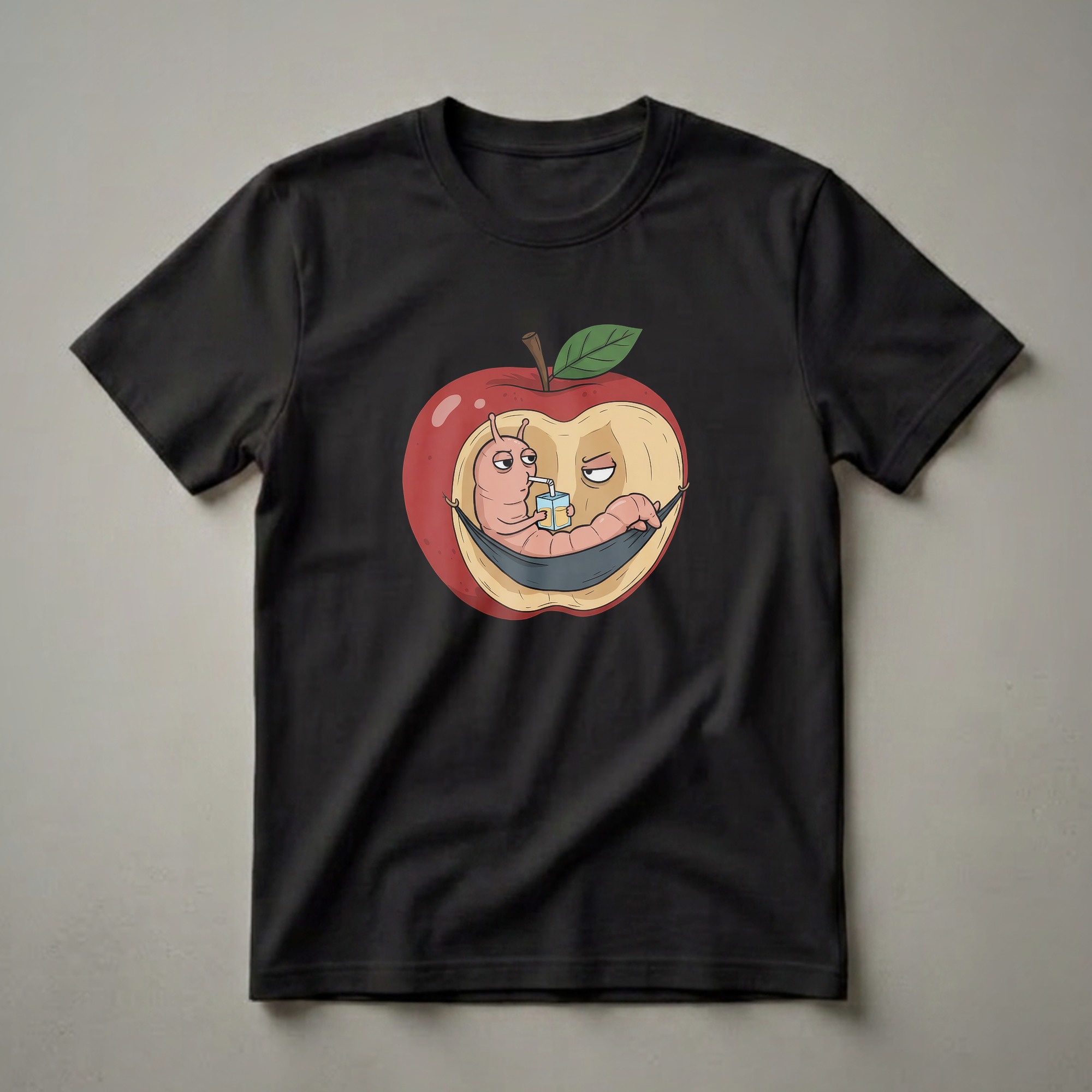 Fruit lovers and fans of quirky humor will appreciate this eye-catching graphic tee. The design showcases a cartoon worm lounging in a hammock, taking a break inside a bright red apple. With a straw in its mouth, the worm sips from a juice box, embodying a relaxed and slightly mischievous attitude. The apple itself is depicted with a bite taken out, revealing the creamy interior where the worm has made its cozy retreat. A single green leaf and stem complete the fruit illustration. This shirt is a thoughtful gift for anyone who enjoys a good pun or a lighthearted take on nature. It's a great conversation starter and a fun way to express a love for unique food-themed art. Wear this tee to casual gatherings, farmers' markets, or simply when you want to add a touch of whimsy to your day. It's a staple in any collection for those who appreciate clever and amusing designs.