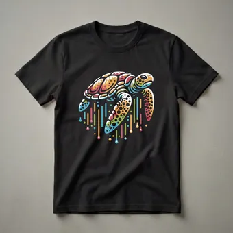 Ocean lovers who appreciate unique artistic interpretations will reach for this eye-catching sea turtle t-shirt. The design features a stylized sea turtle rendered in a bold, geometric art style, showcasing a vibrant palette of colors including orange, red, yellow, blue, and green. Below the turtle, colorful lines and dots mimic dripping water or bubbles, adding a dynamic visual element to the graphic. Sea turtles, such as the Green Sea Turtle, are known for their extensive migrations across oceans, often traveling thousands of miles between feeding grounds and nesting beaches. This tee works well for anyone who admires these majestic creatures and their vital role in marine ecosystems. It makes a thoughtful gift for a marine biologist, a scuba diver, or someone who simply loves the ocean and its inhabitants. Wear this shirt to the beach, on a casual outing, or to a marine conservation event to express your passion for these incredible animals. This graphic tee is a staple in the collection for those who want to make a statement about their connection to the sea.