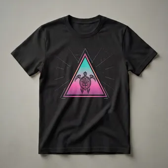 Ocean lovers and fans of unique graphic tees will appreciate this eye-catching design featuring a stylized sea turtle. The artwork is presented within a bold geometric triangle, which itself is outlined with thin, colorful lines that radiate outwards against a speckled black background. The triangle's interior boasts a vibrant gradient, transitioning from a deep teal at the top to a bright pink at the bottom, creating a retro, almost cosmic feel. The sea turtle itself is rendered in a striking black tribal pattern, with intricate swirls and shapes adorning its shell and flippers. Sea turtles, like the green sea turtle, are known for their long migrations across oceans, often traveling thousands of miles between feeding grounds and nesting beaches. This tee works well for anyone who admires these majestic creatures and their connection to the vast ocean. It makes a thoughtful gift for a marine biologist, a surfer, or someone who simply loves the beach and the sea. Wear this shirt to your next coastal getaway or casual outing to make a statement.