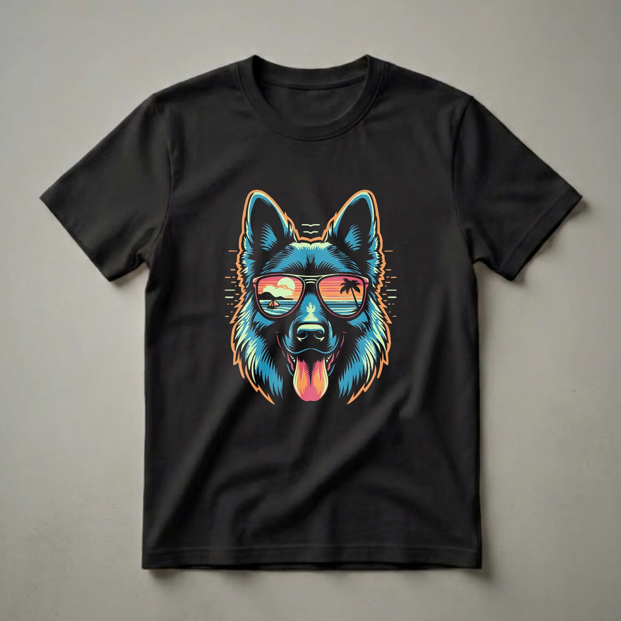 German Shepherd owners who appreciate a touch of retro cool will reach for this eye-catching graphic tee. The design showcases a German Shepherd's head rendered in bold, contrasting colors of teal, orange, and cream, set against a black background. Its most striking feature is the pair of sunglasses worn by the dog, which reflect a vibrant beach sunset scene complete with a palm tree, a sailboat, and distant mountains. German Shepherds, known for their intelligence and versatility, are often seen as loyal companions and capable working dogs. This shirt captures a relaxed, vacation vibe, making it a thoughtful gift for any German Shepherd mom or dad who dreams of sandy shores and ocean breezes. It's a fantastic way to express your passion for the breed while embracing a laid-back, summery aesthetic. Wear this t-shirt to casual outings, dog park visits, or simply when you want to add a pop of color and personality to your everyday look.