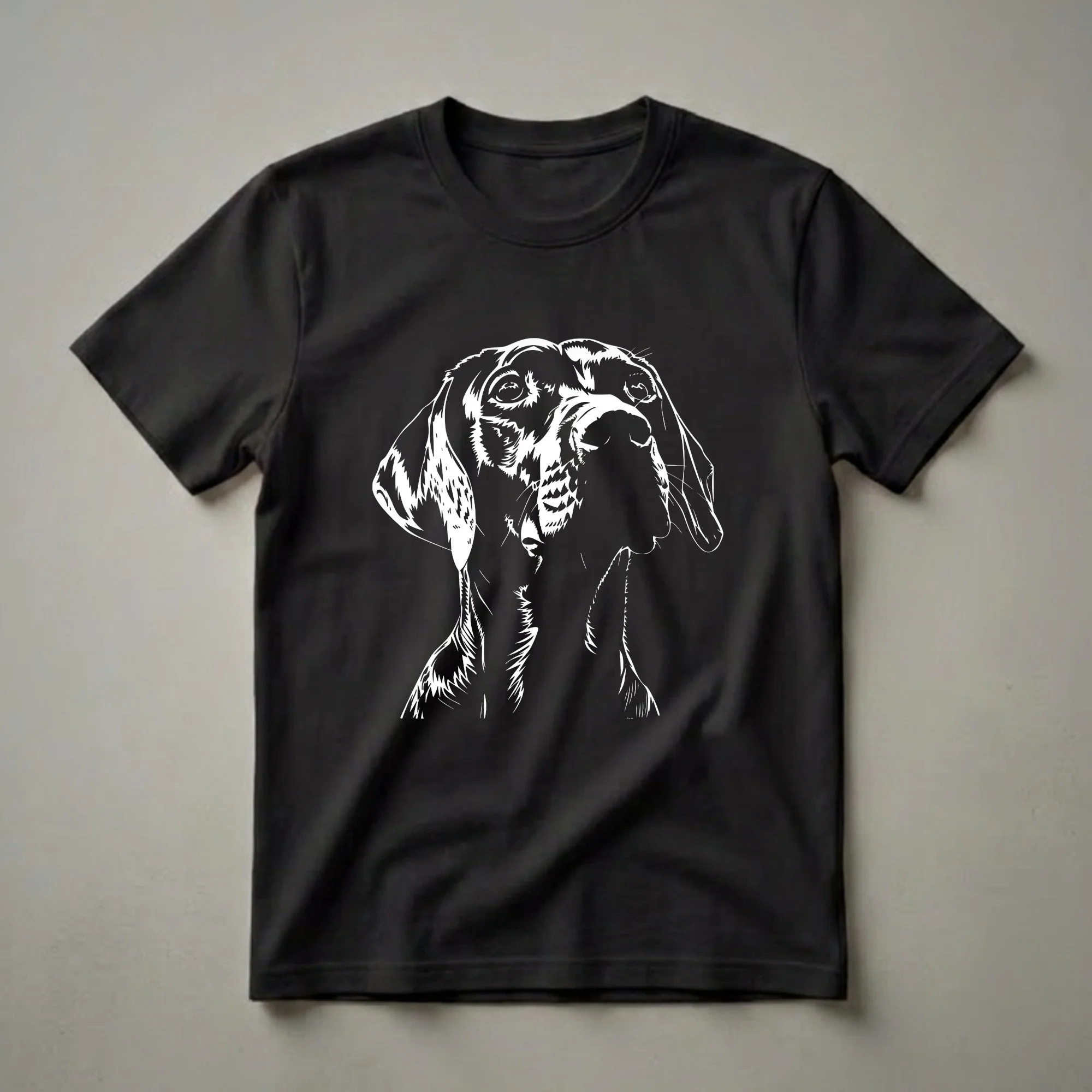 German Shorthair Pointer owners know the breed's energetic spirit and keen intelligence. This graphic tee features a striking white line art illustration of a German Shorthair Pointer's face, capturing its alert expression and distinctive features against a solid black background. The German Shorthair Pointer, originally bred in Germany in the 19th century, is renowned for its versatility as a hunting dog, excelling in pointing, retrieving, and tracking. This shirt is a go-to tee for any proud owner or admirer of this athletic and loyal companion. It makes a thoughtful gift for the German Shorthair Pointer mom or dad in your life, or anyone who appreciates a well-rendered canine portrait. Wear this shirt to your next dog park visit or casual outing to spark conversations with fellow dog enthusiasts.