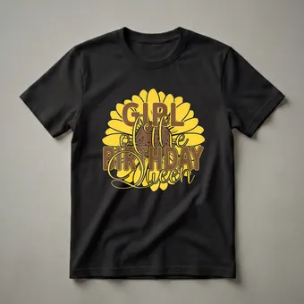 The 'Girl of the Birthday Queen' graphic tee is a cheerful addition to any birthday celebration. This eye-catching design features a large, bright yellow sunflower with a detailed brown center, symbolizing growth and happiness. Bold brown lettering spells out "GIRL of the BIRTHDAY QUEEN" in a playful font, with elegant script for "of the" and a decorative flourish. This t-shirt is a wonderful way for the sister, daughter, or friend of the birthday queen to show her support and join in the festive spirit. Sunflowers, known for turning towards the sun, represent loyalty and adoration, making this shirt a sweet tribute. This tee works well for birthday brunches, parties, or family gatherings. It makes a thoughtful gift for any girl celebrating her queen's special day, offering a unique way to commemorate the milestone. Wear this shirt to show you're part of the royal birthday crew and add a pop of sunshine to the festivities.