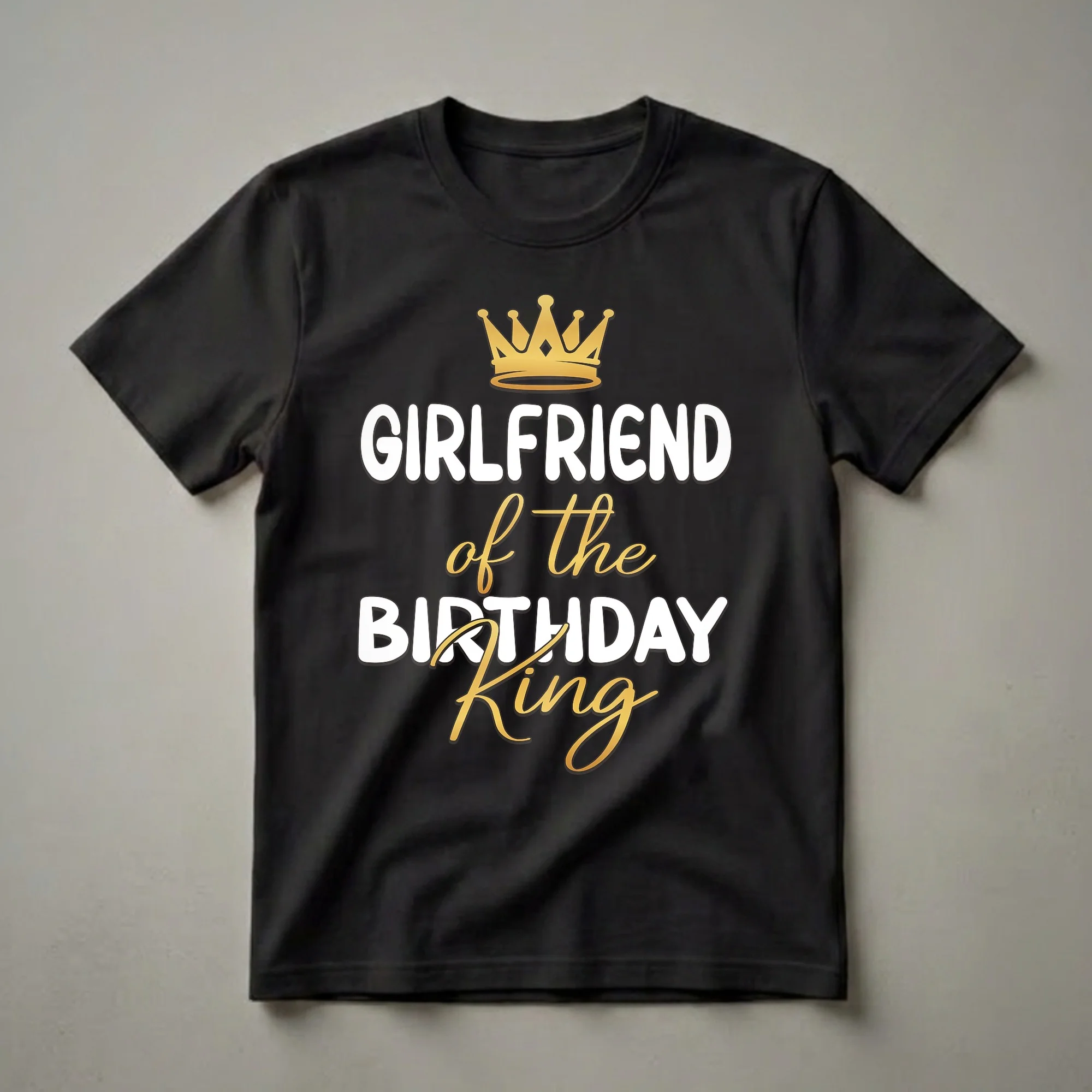 - Features a bold 'GIRLFRIEND OF THE BIRTHDAY KING' statement with a golden crown accent.