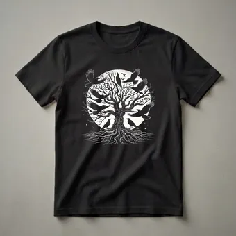 Woodland wildlife enthusiasts and lovers of dark, evocative art will appreciate this striking graphic tee. The design features a gnarled, ancient tree with sprawling, exposed roots, symbolizing deep connection and resilience. Perched on its branches and soaring through the night sky are several ravens, their silhouettes stark against a large, textured full moon. Ravens, known for their intelligence and adaptability, are often associated with mystery and the supernatural, making this shirt a conversation starter. This t-shirt works well for anyone drawn to the gothic aesthetic or the symbolism of the natural world. It's a thoughtful gift for the birdwatcher in your life or for someone who finds beauty in the nocturnal landscape. Wear this unique shirt to your next nature walk, a casual gathering, or simply when you want to express your connection to the wild. The intricate linocut style adds a touch of vintage charm to this modern piece of apparel.