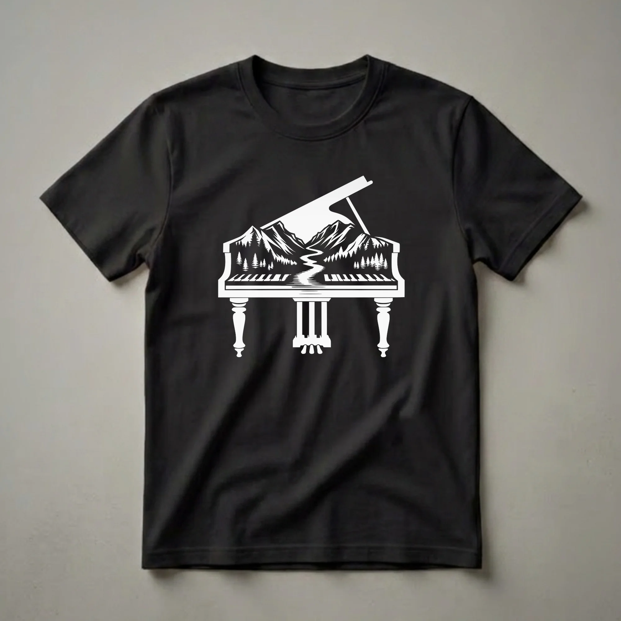 Pianists who appreciate the fusion of nature and music will reach for this striking graphic tee. The design showcases a grand piano, its keys and body transformed into a breathtaking vista. Majestic mountains rise behind a dense forest of pine trees, with a winding river flowing through the valley, reflecting the dramatic peaks. This artistic representation merges the elegance of a grand piano, an instrument known for its wide dynamic range and complex harmonies, with the serene beauty of the natural world. The piano itself is depicted with classic ornate legs and pedals, grounding the fantastical scene. This shirt is a thoughtful gift for any pianist, music teacher, or student who finds inspiration in both the art of music and the great outdoors. Wear this unique t-shirt to your next practice session, a casual concert, or simply when you want to express your passion for the piano and the landscapes that stir the soul. It's a conversation starter for anyone who understands the profound connection between melody and the world around us. The intricate detail within the piano's silhouette makes this a truly eye-catching piece of apparel for any music enthusiast.